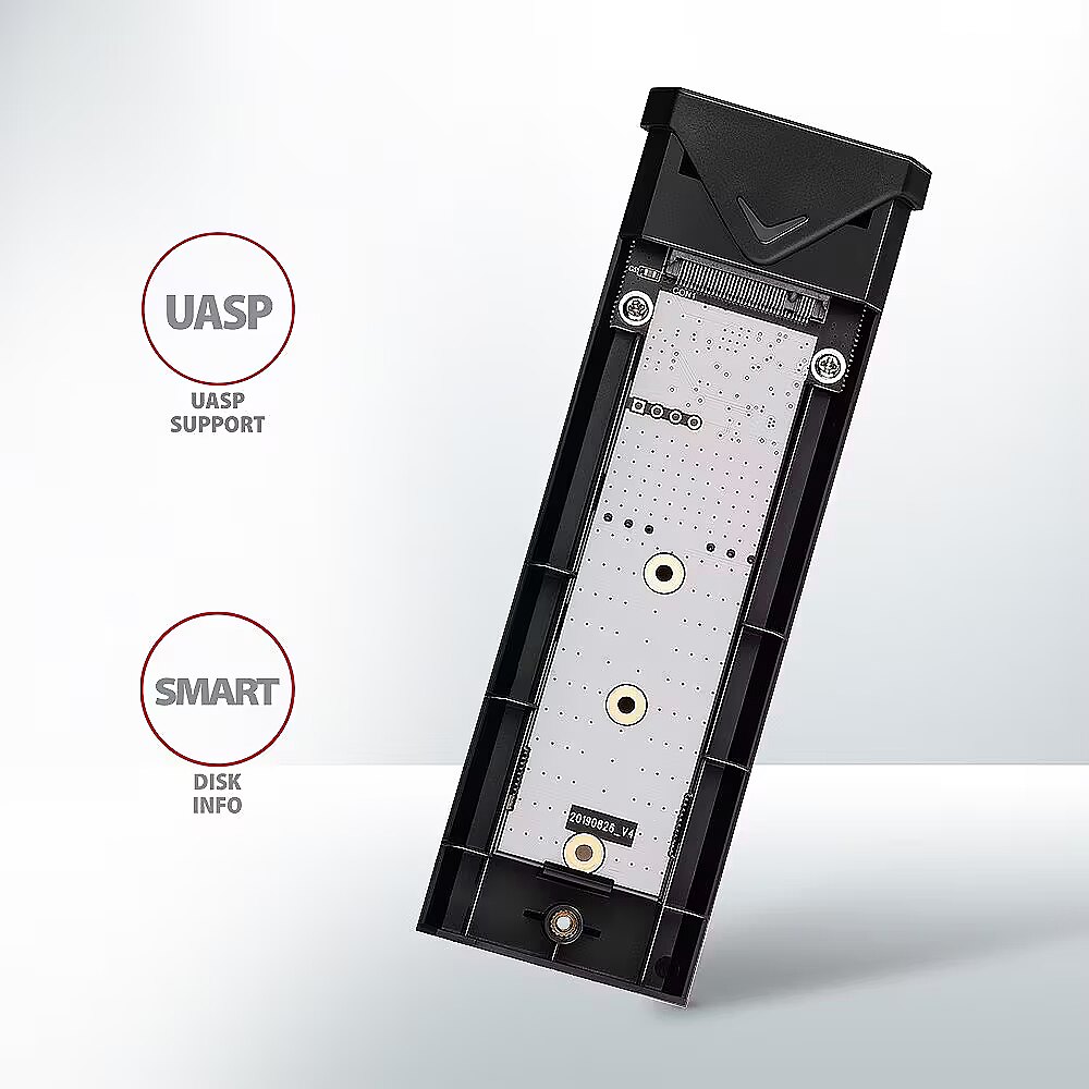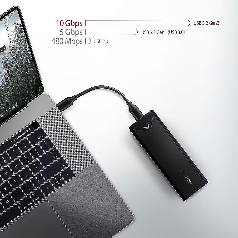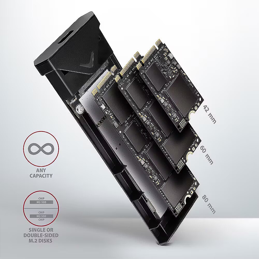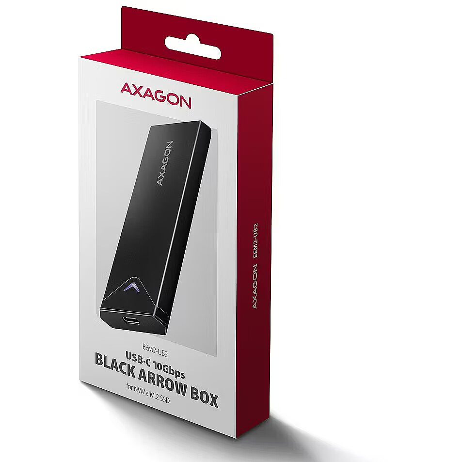 LongDesc - Fast external AXAGON EEM2-UB2 ARROW box with USB 10Gbps interface for M.2 NVMe SSDs. The double-sided USB-C connector on the box enables a reliable connection. In the package you will find an USB-C -> USB-C cable to connect the box to your computer.The transmission rate is up to 10Gb/s thanks to the fast USB 3.2 Gen 2 interface. The external M.2 box also supports other modern features e.g. UASP, TRIM and enables reading S.M.A.R.T. disk status monitoring information. Standby support when idle.The advantage is the attachment of three different lengths of SSD cards - 42, 60 and 80 mm. M.2 drives can be single-sided or double-sided. The box does not limit the capacity of inserted SSD.Opening the box via only one screw makes it easy to mount and dismount the M.2 SSD. Disk replacement is quick and easy, thus expanding the possibilities of using the box, e.g. for data migration, testing, etc.The outer metal housing is made in black colour with an elegant finish, that prevents unwanted fingerprints.Aluminum box body and thermal conductive pad provides very good M.2 SSD disk cooling. This extends its service life and also prevents the disk from slowing down, so-called „Thermal Throttling“.By inserting the M.2 SSD in the box, you will easily create fast compact and universal external disk. The box can be used with computers and notebooks, as well as with mobile phones and tablets. Input:• USB 10Gbps (USB 3.2 Gen 2), connector USB-C female.• Compatible with USB 3.2 Gen 1, USB4 and Thunderbolt 3/4.Device support:• NMVe M.2 SSD disks,• designed for M key or B+M key card formats,• NGFF 75-pin M key slot for M.2 drives.Other features:• Supports transmission rates 10.000 / 5000 / 480 Mbit/s.• Support of M key or B+M key NVMe (PCI-Express) M.2 SSD disks without a maximum capacity limit.• Support of M.2 drives with a size of 2242, 2260, 2280 mm.• Support of both one-sided and double-sided M.2 SSDs.• Compliant with PCI Express Base Specification Revision 3.1a specification.• Compliant with NVM Express 1.3 specification.• Compliant with USB Mass Storage Class specification.• The total bandwidth / transmission rate of the adapter is determined by the USB interface used (theor. 10 Gbit/s).• The real adapter bandwidth / transmission rate is about 1.000 MB/s (1 GB/s), it is given by the limits of the USB 3.2 Gen 2 interface.• Supports BOT (Bulk-Only Transport).• Supports UASP (USB Attached SCSI) for faster data transmission in Windows 8 and later.• Supports TRIM functionality to limit gradual degradation of the SSD performance over time.• Supports S.M.A.R.T. (Self-Monitoring, Analysis, and Reporting Technology) system monitoring disk condition.• SSD boot support in external box.• Possibility to connect your device while running thanks to the Hot Plug support.• Full Plug and Play support.• Standby support - drive asleep after 5 minutes of inactivity.• Power supply via USB 3.0 bus up to 900mA from one USB port is sufficient in all cases.• A decent blue LED indicating the connection to the computer's USB port (permanent light) and data transmission (blinking).• Heavy-duty aluminium body and thermal conductive pad helps to better cooling the M.2 SSD disk.• Higher box surface temperature is not a defect - thanks to the aluminum body, the heat generated by the disk operation is better drained and transferred to the environment.• Connection via USB 3.2 Gen 2 type C female connector.• USB type C male / USB type C male cable length 20 cm in the package.Other data:• Box dimensions 115 x 39 x 11 mm.• Box weight 43 g (without cable and M.2 SSD disk).Supported operating systems:• Windows 7 / 8.1 / 10 / 11 and later, macOS, iPadOS, iOS, Linux, Chrome OS and Android.• Compatibility depends on the operating system and device manufacturer support.• Note: when Windows 7 used it is necessary to check OS support and driver availability with the M.2 SSD manufacturer.Package contains:• USB-C 10Gbps external box for M.2 SSD,• USB-C - USB-C cable 20 cm long,• 3 thermal conductive pads,• mounting material and a screwdriver,• multilingual manual CZ / DE / DK / ENG / ESP / FIN / FR / GR / HR / HU / IT / NL / PL / PT / RO / SK / SWE / TR / UA / BG / CN / ARA,• packed in a cardboard box with a hanging hole.