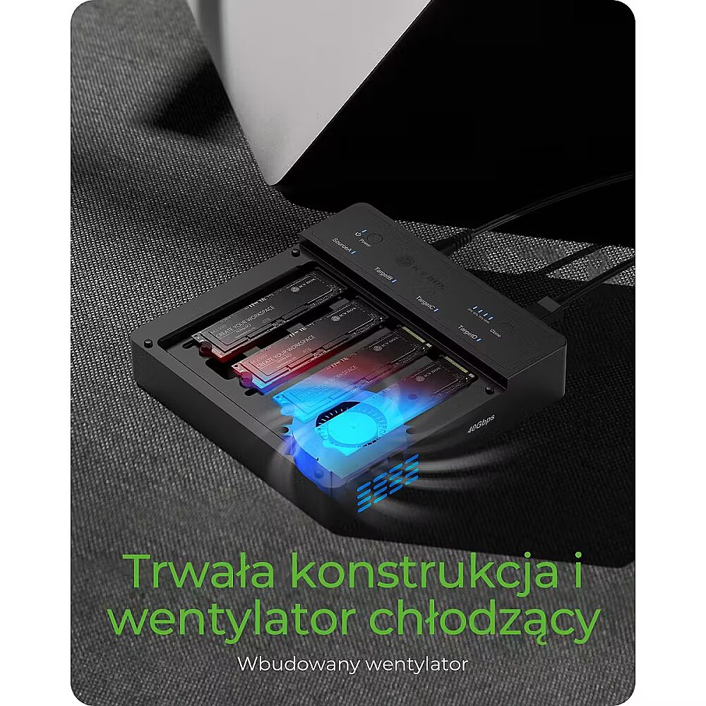 1:3 Offline Cloning: Allows duplicating data from one NVMe M.2 SSD onto up to three others simultaneously, simplifying data transfer. High-Speed USB4 Performance: Delivers up to 40Gbps through USB4, while each SSD bay supports speeds up to 16Gbps, ideal for rapid data access. Tool-Free Installation: Magnetic suction cover allows easy SSD installation and removal without tools, making it accessible for all users. Efficient Cooling System: Built with an aluminum shell and an integrated fan to maintain optimal temperatures, supporting stable performance during extended use. Clone Progress Indicators: LED lights display the clone progress in 25% increments, providing real-time status updates. Compact and Durable Design: Crafted from aluminum for added durability and heat dissipation, combining both style and functionality.