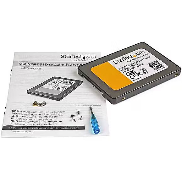 LongDesc - Convert an M.2 solid state drive into a standard 2.5in form factor 6Gbps SSDVastly increase system performance by replacing your 2.5” SATA hard drive with an M.2 solid state drive, using the SAT2M2NGFF25 M.2 SSD to SATA adapter.The M.2 to SATA adapter features an enclosed housing that adds protection to your NGFF (Next Generation Form Factor) SSD. The added protection gives you the peace of mind to confidently use your M.2 drive in applications that require an added level of durability such as hot-swap drive bays, or external SATA docking stations.Using an M.2 SSD in place of a platter drive better utilizes the full potential of your SATA III controller, by reducing your data transfer bottleneck with file transfer speeds up to 6 Gbps -- an ideal solution for further increasing the performance of a HyperDuo array.For wide compatibility with all of the common M.2 solid state drives, the SAT2M2NGFF25 supports multiple drive heights including: 2230, 2242, 2260, 2280.The SAT2M2NGFF25 is backed by a StarTech.com 2-year warranty, and lifetime technical support.The StarTech.com Advantage- Added protection for your SSD with enclosed housing- Maximize system performance by replacing you 2.5in SATA platter drive with an M.2 SSD- Broad compatibility with support for the most common M.2 NGFF SSD heights (2242, 2260, 2280)