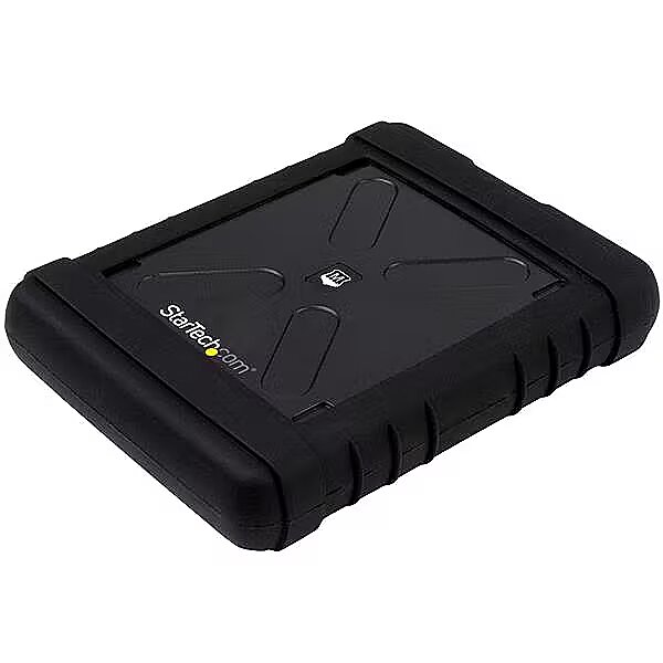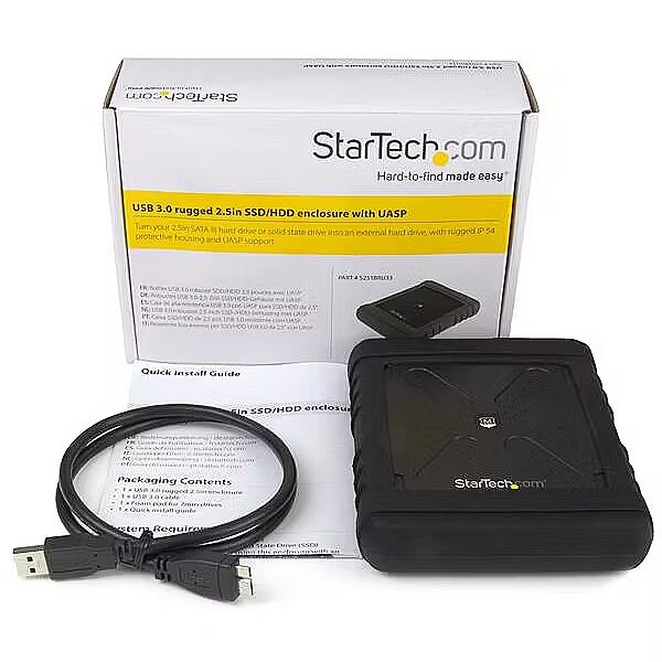 LongDesc - Gear up for the field with portable hard drive protectionThis rugged drive enclosure redefines data protection for on-the-go professionals. The military-grade construction protects your sensitive data from harsh field conditions. It makes sure you’re equipped for unexpected challenges with a ruggedized water, dust, vibration and shock resistant enclosure.Industry recognized protection against water and dust, with an IP54 ratingKeep your data safe and secure even through sudden downpours or dust storms. The robust enclosure provides superior water and dust resistance with an IP54 rating.Drop tested for 4 meters (13 feet)The rugged drive enclosure is enveloped in a silicone protective sleeve, and engineered to help protect your drive from accidental and unexpected shock, vibrations, and drops. It’s Military MIL-STD-810G rated and test-proven to withstand drops of up to 4 meters (13 feet). It was drop tested using a solid-state drive in the enclosure.Data protection inside and outWherever you go, the rugged drive enclosure delivers reliable data protection, inside and out. The tough-wearing exterior casing provides shock-resistance, while the flexible silicone sleeve hugs the entire perimeter to ensure an extra measure of protection, absorbing the impact of accidental bumps, rough baggage handling or drops. Inside, an extra layer of silicone provides added drive stability.Install your drive with ease, with a tool-less designIt’s easy to turn your 2.5in SATA III (6Gbps) solid-state drive or hard drive into external storage. Simply remove the silicone sleeve, open the latch to insert your 2.5" drive into the rugged enclosure, and plug the included USB cable into the computer or hub USB port. There are no screws or tools needed.70% faster than traditional USB 3.0, with UASPSave time in the field, by storing and transferring content quickly. Enhanced with UASP (USB Attached SCSI Protocol), this rugged drive enclosure performs with a 70% faster read speed and 40% faster write speed over conventional USB 3.0, when paired with a UASP-enabled host controller.UASP is supported in Windows 8, Mac OSX (10.8 or above), and Linux. In testing UASP performs with a 70% faster read speed and 40% faster write speed over traditional USB 3.0 at peak performance.At the same peak in testing UASP also shows an 80% reduction in required processor resources.Testing results were obtained using an Intel Ivy Bridge system, a UASP enabled StarTech.com enclosure, and a SATA III (6Gbps) solid state drive.The S251BRU33 is backed by a StarTech.com 2-year warranty and free lifetime technical support.The StarTech.com Advantage- Protect your data even in the toughest field conditions- Military Rated (MIL-STD-810G) drive enclosure provides exceptional shock resistance- Outstanding water and dust resistance with IP-54 rating