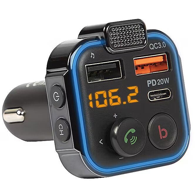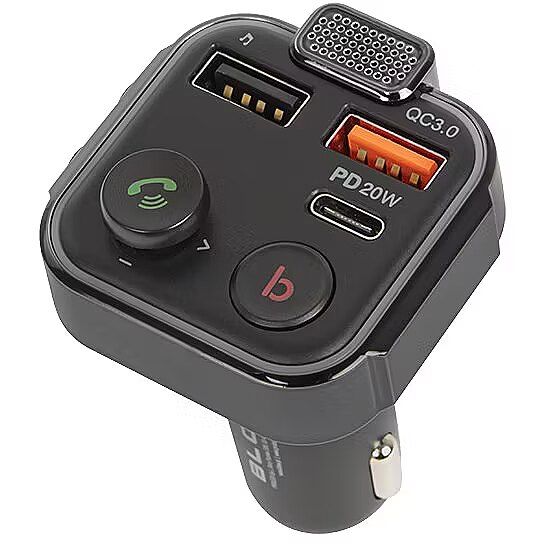 Citas funkcijas - Galvenās iezīmes Bezvadu tālruņa zvana un audio atskaņošanas pārraide uz automašīnas stereo FM sistēmu, izmantojot Bluetooth Hands-free režīms, kas automātiski pārslēdzas no mūzikas atskaņošanas statusa, saņemot zvanus Uzlabota basa pastiprināšanas tehnoloģija, ko aktivizē, nospiežot attiecīgo pogu Specializēts mikrofons, kas ievērojami uzlabo skaņas uztveršanu Moderns dizains ar LED displeju Atbalsts microSD karšu lasīšanai Divas USB uzlādes pieslēgvietas, tostarp viena ar Quick Charge un viena USB-C PD20W Asistenta aktivizēšanas iespēja (viedtālruņa funkciju izmantošana) Piecu virzienu daudzfunkciju navigācijas poga Jaunākā Bluetooth 5 tehnoloģija.0 Delikāts LED aizmugurējais apgaismojums