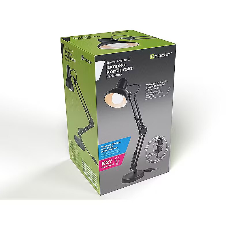Apraksts - Darbs pie rakstāmgalda bieži vien ļoti noslogo acis, tāpēc ir vērts parūpēties par pareizu apgaismojumu, kas nenogurdina redzi. Labi izvēlēta galda lampa atvieglo mācīšanos, mazina acu spriedzi un pat palīdz koncentrēties. Ja meklējat funkcionālu ierīci, kas atvieglos jūsu darbu, izvēlieties Tracer Architekt! Regulējams slīpuma leņķis Papildu stiprinājuma kronšteins pie galda Ilgs barošanas kabelis Parūpējieties par savu darba komfortu Zīmēšanas lampa Tracer Architekt ir stabili izgatavota ierīce, ko ar stabilu kronšteinu varat viegli piestiprināt pie galda vai citas horizontālas virsmas. Tādējādi jūs varat būt droši, ka, strādājot nelielā telpā, nejauši to nenolauzīsiet. Lampa ir aprīkota ar elastīgu roku, tāpēc jūs varat regulēt gaismas krišanas leņķi pat trīs locītavās. Tas ļaus precīzi izgaismot elementus, pie kuriem pašlaik strādājat. Regulējot lampas leņķi, jūs varat arī novietot to tā, lai tiešā krītošā gaisma jūs neapžilbinātu. Izturīga konstrukcija Tracer lampa ir izgatavota no metāla un ABS plastmasas kombinācijas, kas padara to īpaši izturīgu pret bojājumiem. Laika ritējums tai arī nekaitēs, tāpēc varat būt droši, ka tā kalpos jums daudzus gadus. Ierīce ir aprīkota ar garu kabeli (150 cm), tāpēc jums nebūs jāorganizē sava darba vieta pie elektrības rozetes. Uz kabeļa izvietotais ieslēgšanas/izslēgšanas slēdzis ir ļoti praktisks risinājums, kas ļauj ātri un ērti iedarbināt lampu. Garais metāla posms ļaus apgaismot lielāko daļu darba virsmas. Universāls gaismas avots Lampas abažūrs ir aprīkots ar E27 vītni, kas padara to par ļoti universālu ierīci, kas ir pielāgota lielākajai daļai tirgū pieejamo spuldžu. Izvēloties gaismu savai lampai, pievērsiet uzmanību arī tās parametriem, vislabākā koncentrācija un efektivitāte tiks sasniegta ar dienas gaismai tuvu krāsu temperatūru un krāsu atveides indeksu (Ra) virs 80.