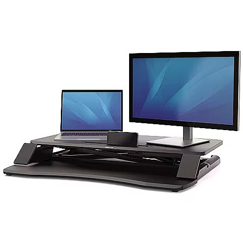 LongDesc - The Fellowes Sit Stand Workstation desk adds movement to your day to help you work and feel better - effortlessly. Too many hours sat at your desk is damaging your health which is why the Corsivo sit stand desk is essential for your workspace. Transform your sedentary desk into a dynamic sit stand workstation and add movement to your working day to stay active and healthy. Easily transition from a sitting to standing desk with gas spring height adjustment which allows you to effortlessly change your working position. The Corsivo sit stand desk offers a two-tiered large work surface which accommodates flexible set up options, holding two monitors or a monitor and a laptop. This standing desk allows you to keep your phone or other accessories within easy reach with its convenient device channel. Easy set up – simply attach the optional keyboard tray and you're ready to use your sit stand desk.