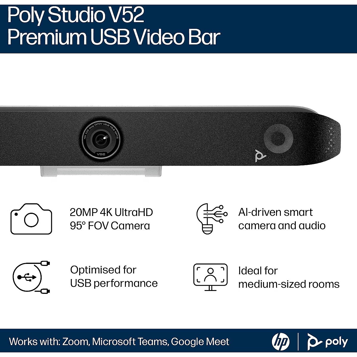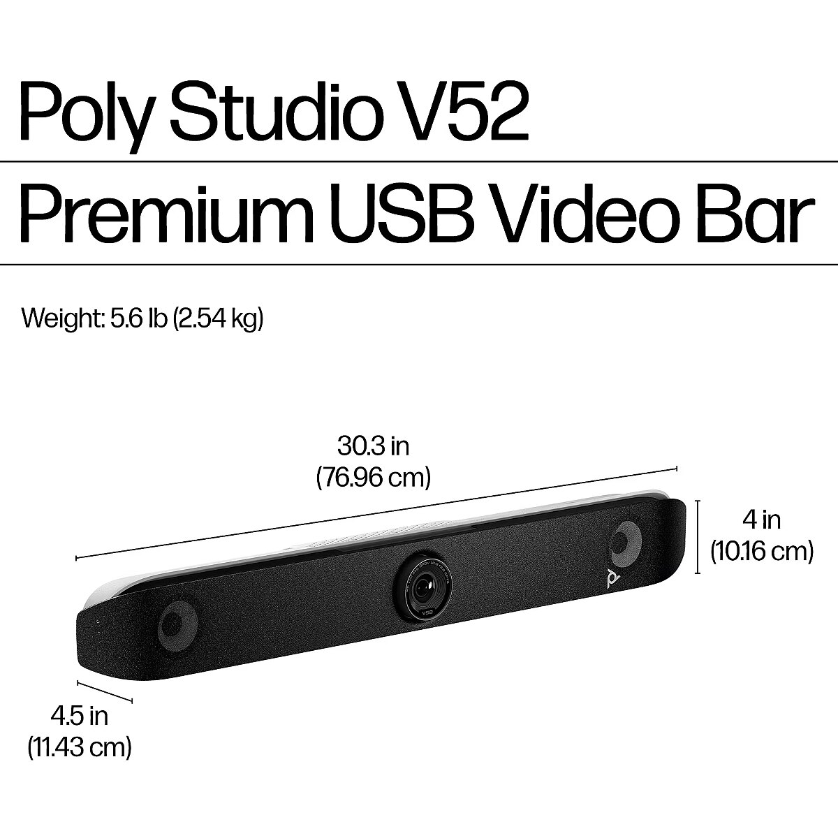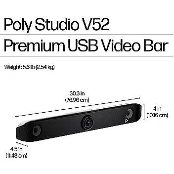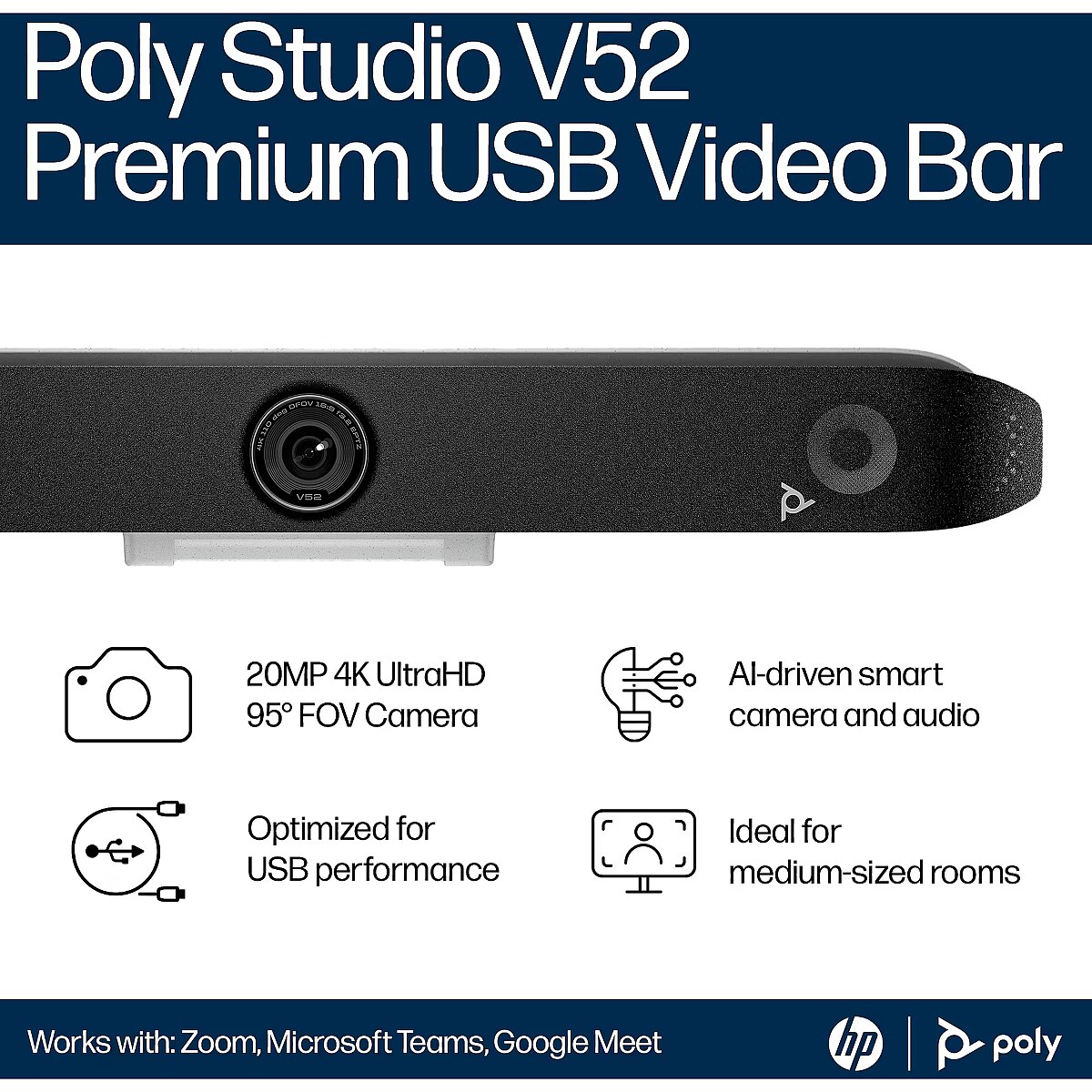 LongDesc - Raise the bar with every meeting.For the latest in advanced conferencing tech coupled with USB simplicity, Poly Studio V52 Premium USB Video Bar has joined the call. Make effortless, crystal-clear connections in any medium-sized room thanks to striking visuals and next-gen AI features.