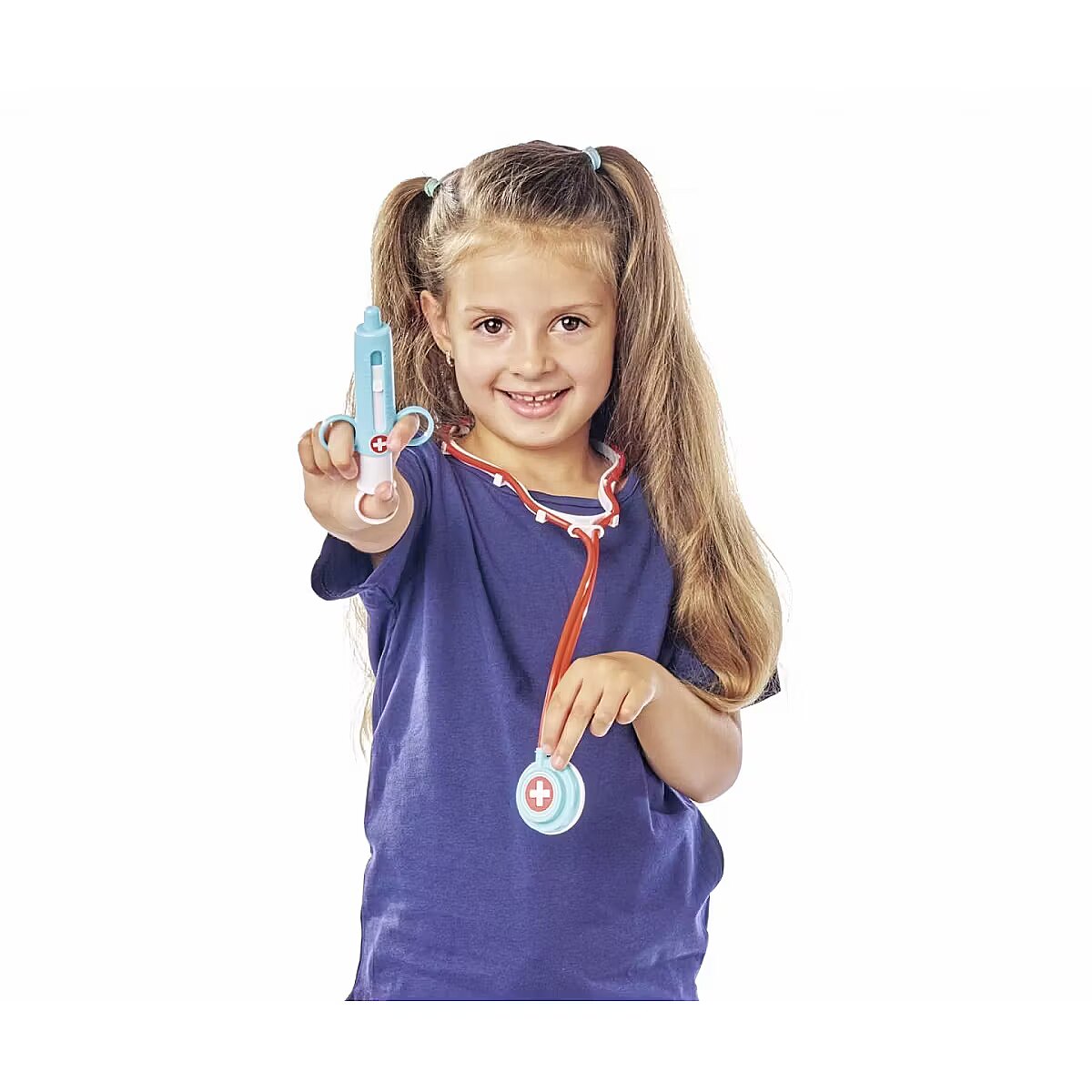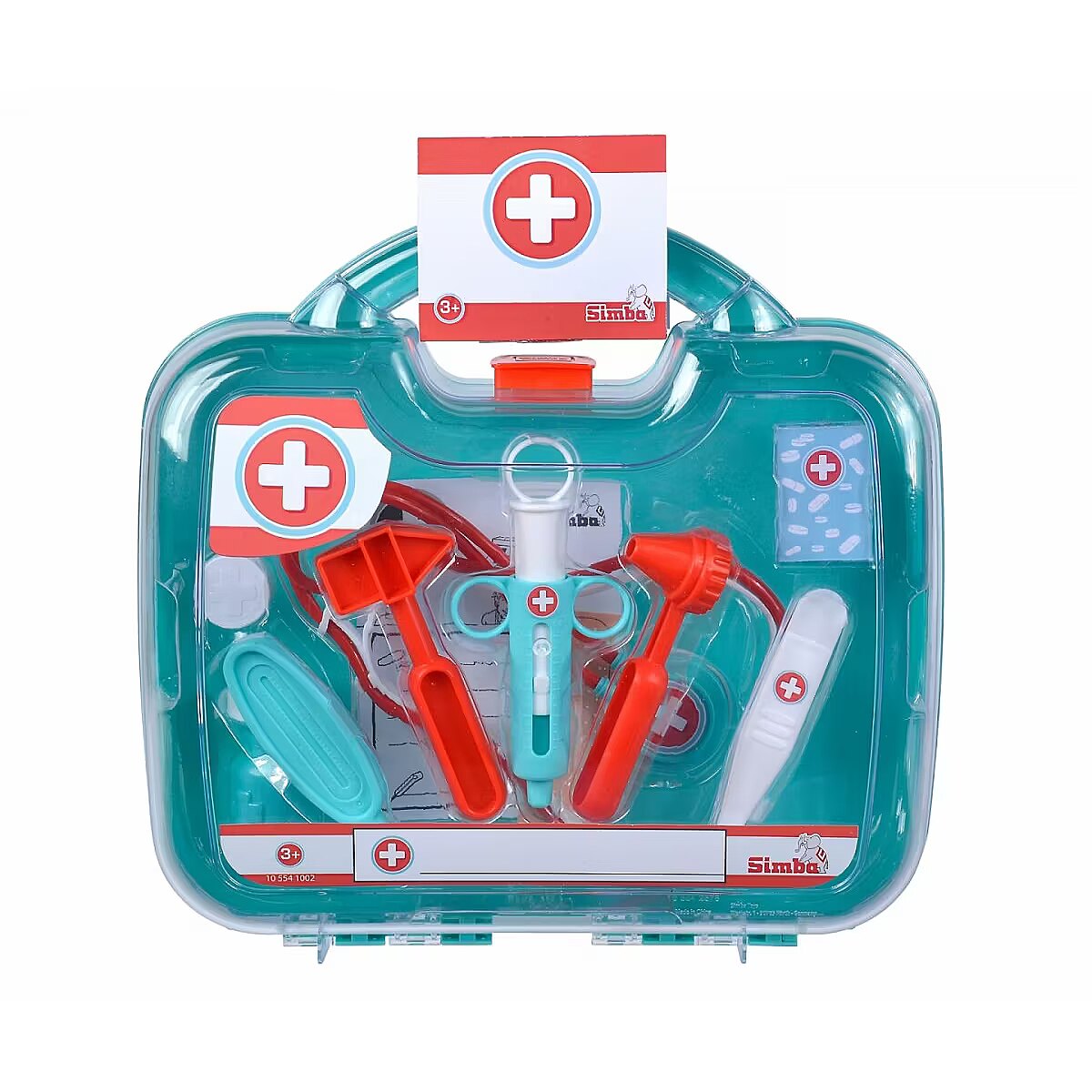 Description - Duża walizka lekarza Walizka lekarza z przezroczystym wieczkiem i akcesoriami. Duża walizka lekarska - z nowoczesną walizką lekarską pacjenci dzieci są zawsze doskonale zaopiekowani. Zawsze w pogotowiu - wygodna przenoszenia i zabierania torby zawsze ze sobą ułatwia wbudowany uchwyt. 12-częściowy zestaw - zabawkowa walizka medyka z niezbędnymi 12 akcesoriami: zawiera stetoskop do osłuchiwania, strzykawkę, termometr, pęsetę, bloczek na recepty, leki i wiele więcej. Kompaktowa wielkość - dzięki rozmiarowi 30x28 cm zabawkowa walizka lekarska dla dzieci nadaje się również do wizyt domowych i maluszki zawsze mają wszystko pod ręką by zbadać każdego pacjenta. Walizka lekarska pozwala oswoić się dziecku z wizytą u lekarza i pomaga zrozumieć wiele czynności medycznych, duża walizka lekarska dla dzieci od 3 roku życia. Zabawa tą bogato wyposażoną walizką medyczną od Simba pozwala spełniać marzenie dzieci, by leczyć ludzi, przygotowuje młodego lekarza do medycznych wyzwań. Zabawa w lekarza wyrabia w dziecku samodzielność i wytrwałość przy realizowaniu podjętych zadań. Walizka lekarska zawiera wszystko czego potrzebuje młody lekarz podczas leczenia swoich pacjentów. Zabawa w lekarza nie tylko oswaja lęk przed wizytą u pediatry a jednocześnie poszerza zakres wiedzy o pracy medyków. Zabawkowa walizka medyczna stanowi najlepszy prezent dla tych dzieci, których fascynuje świat lekarza i którzy chętnie pomagają innym. Jest dedykowana dla małych rączek, dzięki czemu dzieci mogą ją samodzielnie przenosić i zabrać ją ze sobą wszędzie tam, gdzie wymagana jest natychmiastowa pomoc lekarza. Zestaw lekarski dla dzieci został stworzony przez renomowaną firmę Simba, która od lat projektuje praktyczne i bezpieczne zabawki z dbałością o szczegóły i estetyczne wzornictwo, aby rozbudzać entuzjazm u wszystkich dzieci i umacniać w nich zdolności manualne.
