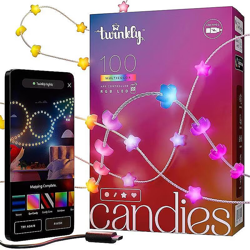MediumDescription LV - Twinkly Candies, zvaigžņveida, viedā gaismas virtene piešķirs burvību jebkurai jūsu mājas dzīves telpai ar neparastu spilgtumu un pielāgojamiem efektiem, kas kartējami no jūsu tālruņa, un vieglu, pārnēsājamu dizainu. Neatkarīgi no tā, vai vēlaties sava bērna istabā radīt mājīgu mirdzumu, izveidot burvīgus straumēšanas iestatījumus, izcelt svētku svinības vai piešķirt savam interjeram personalizētu pieskārienu. Iestatiet ainu ar Candies. • Kontrolētas ar lietotni: kontrolējiet visus savus rotājumus, izmantojot tikai mobilo lietojumprogrammu Twinkly