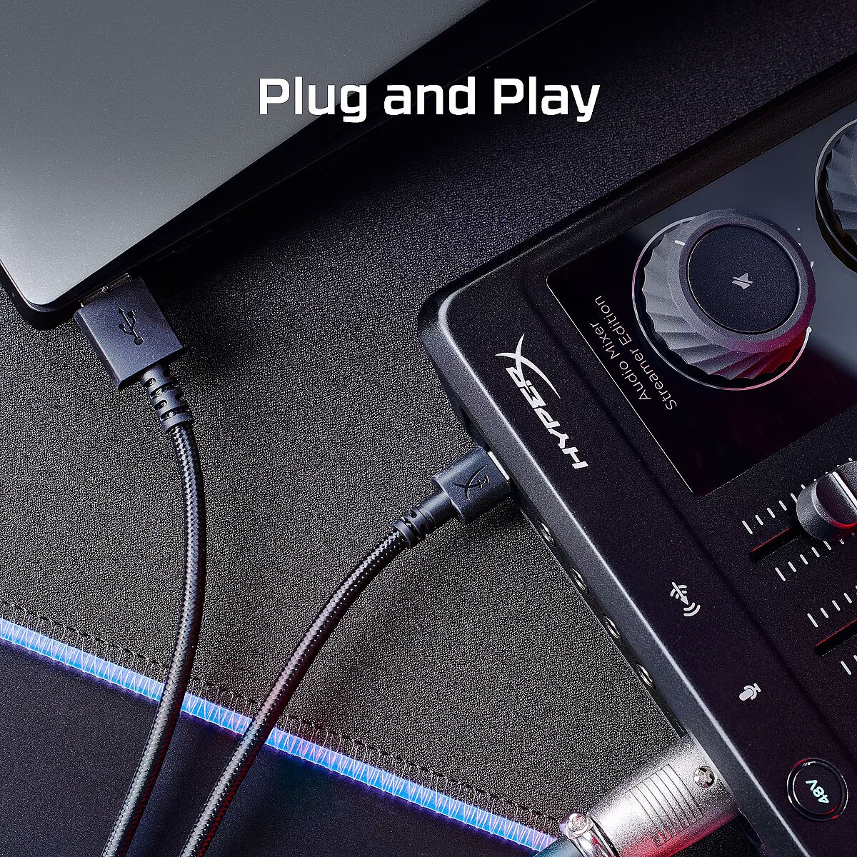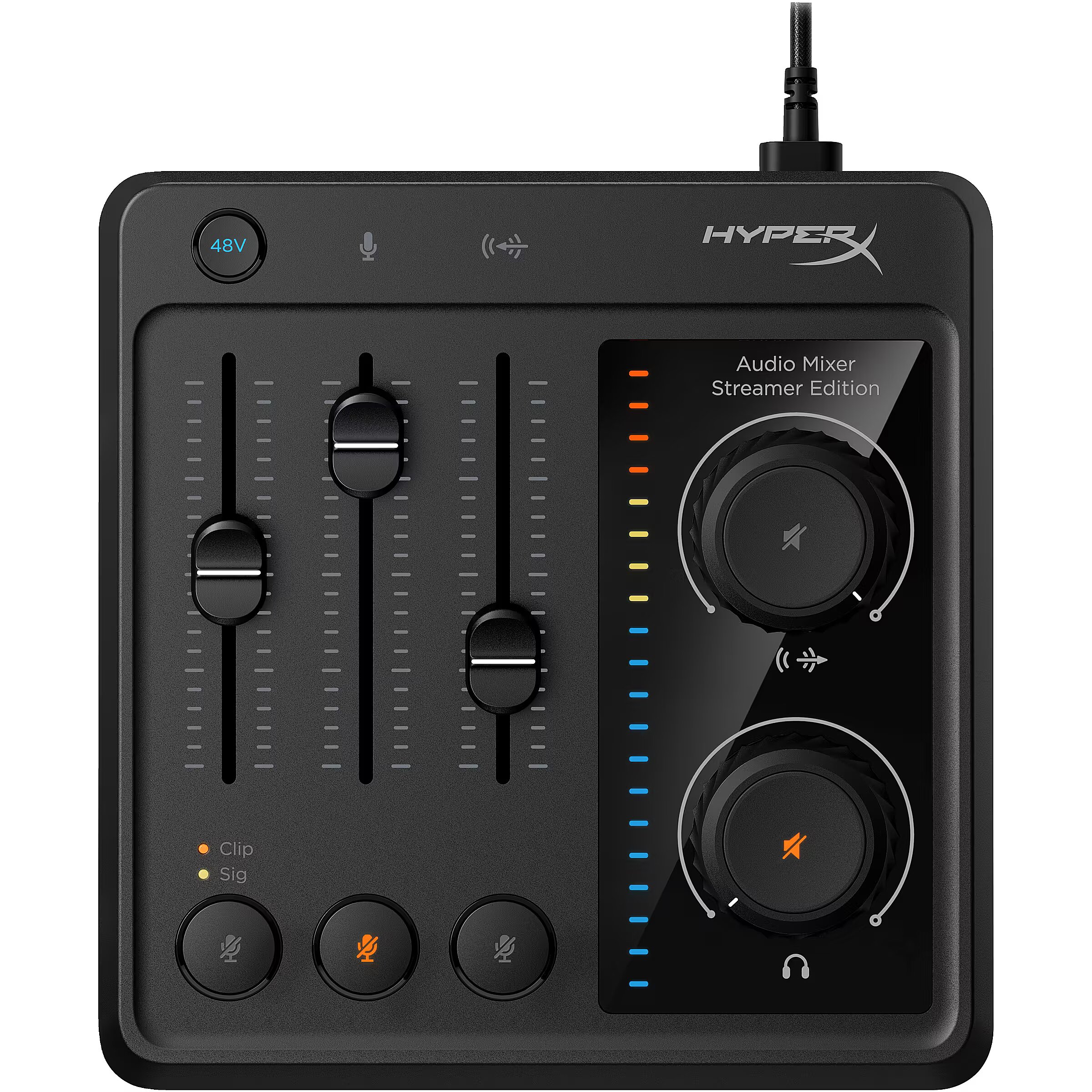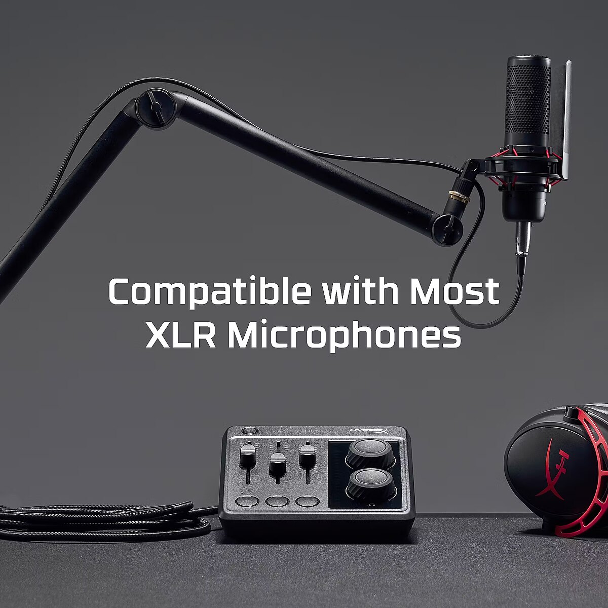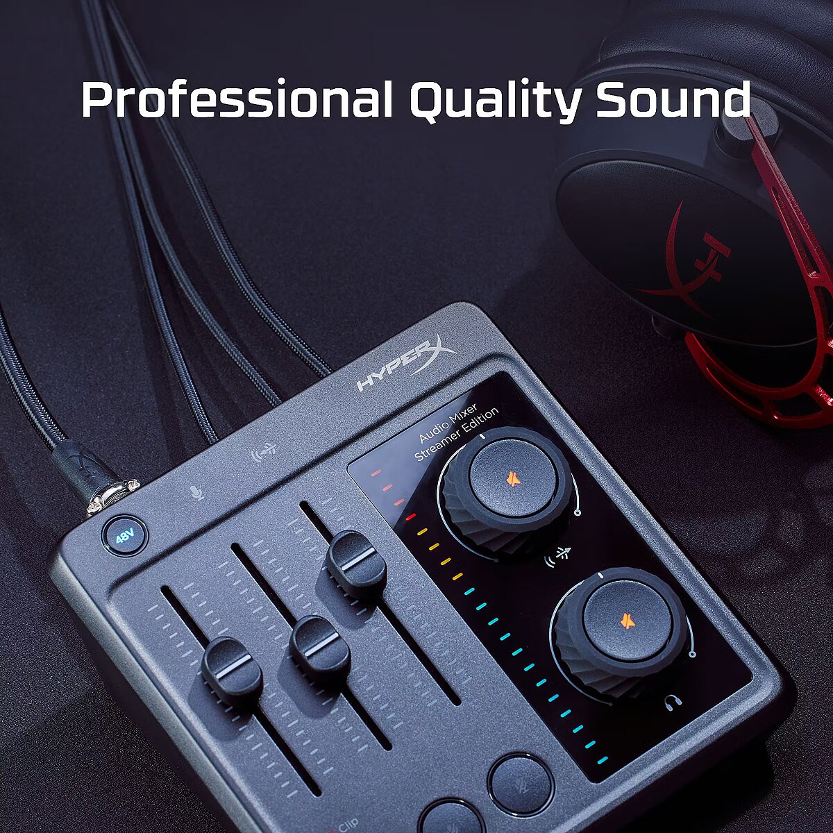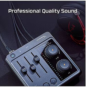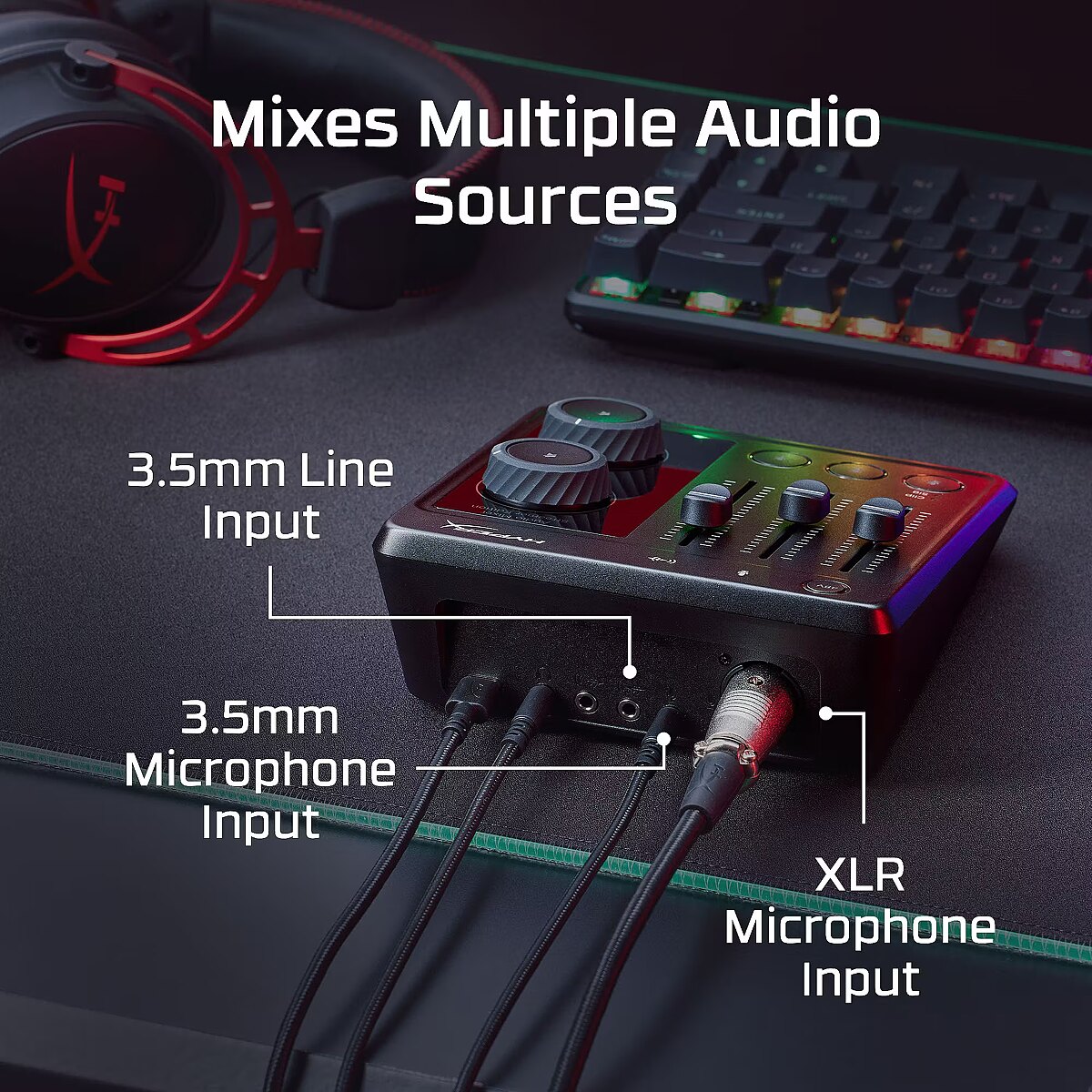 LongDesc - Effortless, Pro-Level Audio Mixing.The HyperX Audio Mixer is for creators who want to easily mix up to 3 audio sources: an XLR input, 3.5 mm microphone input, and a stereo 3.5 mm line input. This compact USB mixer features intuitive controls, so you won’t bring your recording to an abrupt halt. With 3 faders, and individual volume knobs for line and headphone outputs, you can easily find your perfect balance. With support for 24-bit/96kHz recording and the HyperX ProCast and most other XLR mics, you’ll get professional-quality sound.