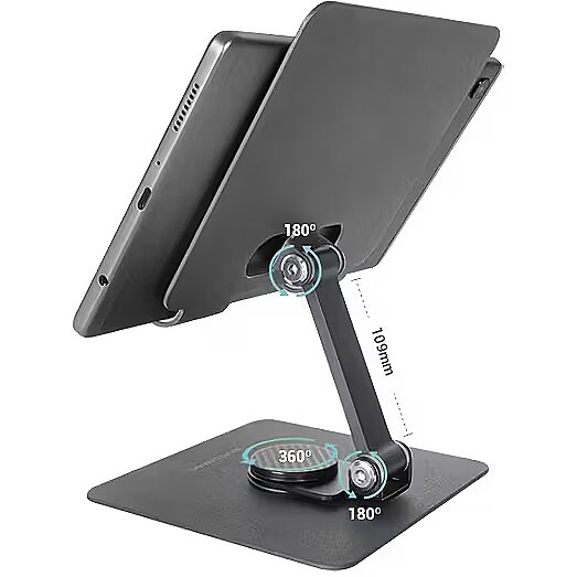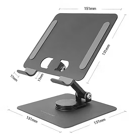 Tehniskā specifikācija: Materiāls: alumīnija sakausējums Izmēri: 148x151x42 mm. Svars: 650 g. Formāts: kompakts un salokāms. Regulēšana: augstums, 180° slīpums un 360° pagrieziens. Maksimālais atbalstītais svars: 3 kg. Savietojamība: viedtālrunis, planšetdators, iPad un 2-in-1 Transformers (līdz 13 collu). Pēdas: neslīdošs silikons.