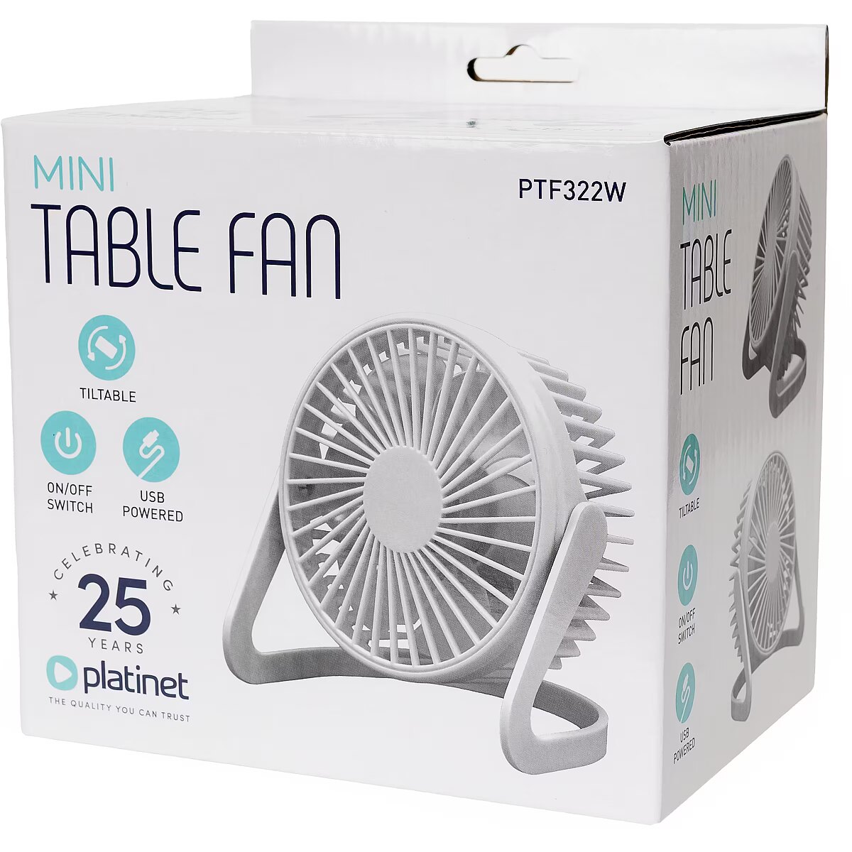 description_en - The Platinet PTF322 USB desk fan is a compact and efficient solution if you need a refreshing airflow to cool your desktop or small room. The fan is made of durable ABS plastic and its tilting design allows you to direct the airflow exactly in the desired direction. The device operates with one speed level and is easy to control with one button. USB power allows you to connect the fan to a computer, power bank or USB adapter. Thanks to its lightweight and compact design, it is ideal for use at home, in the office or when traveling. Dimensions: 15 × 15 × 12 cm Weight: 152 g Power supply: USB-A cable