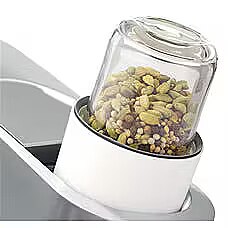 MediumDescription EN - A great little accessory for chopping, milling, grinding and blending small portions of food into glass jars. Great for baby foods, spices, coffee, marinades, dressings, purées, herbs and nuts. And it comes complete with three glass jars for handy storage. The smaller container means you can chop much more quickly and finely than you can with a larger mill attachment. The flat blade is great for coffee beans.