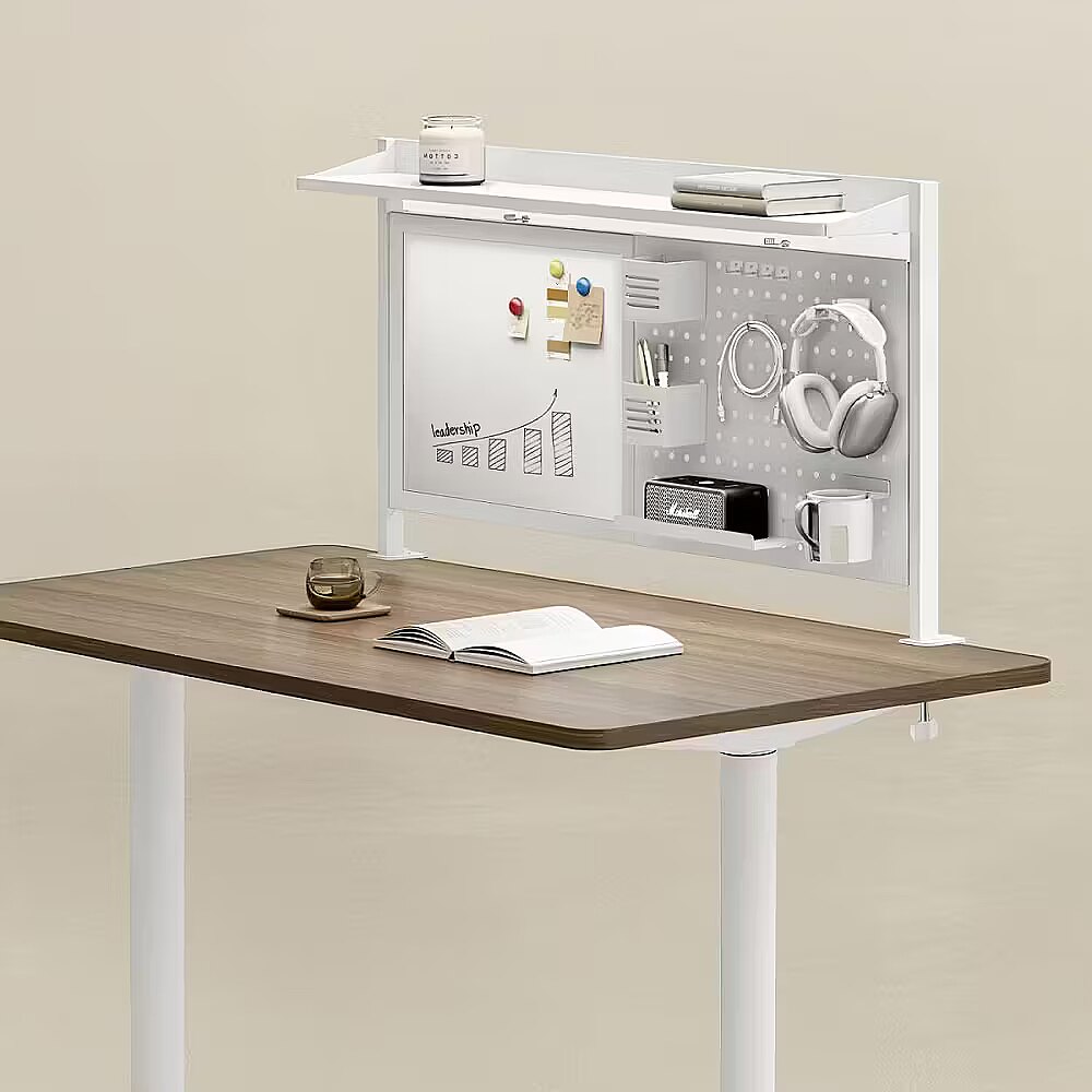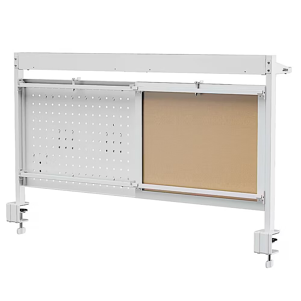 Description - The ER-301 multifunctional desk extension is a compact and extremely practical solution for people who want to organize their workspace and have all the necessary accessories at their fingertips. The design attaches to the tabletop with sturdy metal clamps to ensure stability without the need for drilling. A narrow top shelf running the full width of the extension is ideal for small items such as notes, decorations or an office organizer. The centerpiece of the ER-301 extension is a magnetic dry-erase board on which you can conveniently write notes with a marker (included) and wipe them off with a sponge. Next to it is a perforated metal board that allows free arrangement of accessories. Among others, it comes with four hooks, two pen containers, a cup holder, a shelf, as well as a set of 5 magnetic pins and 3 magnets, giving you full organizational freedom. All this makes the ER-301 extension desk not only an aesthetically pleasing addition to the desk, but also an extremely practical organizational tool that increases the efficiency of work and improves the comfort of daily use.