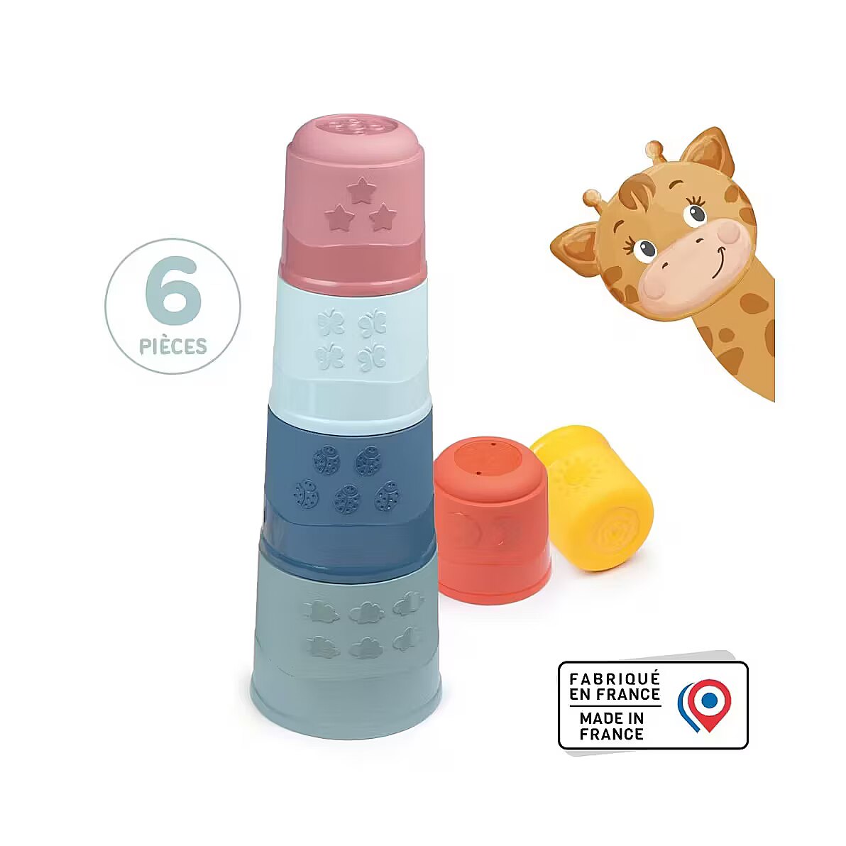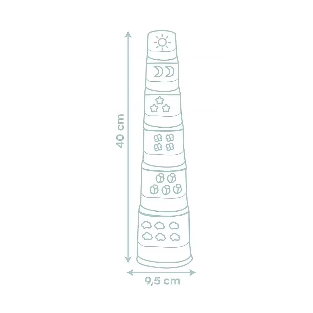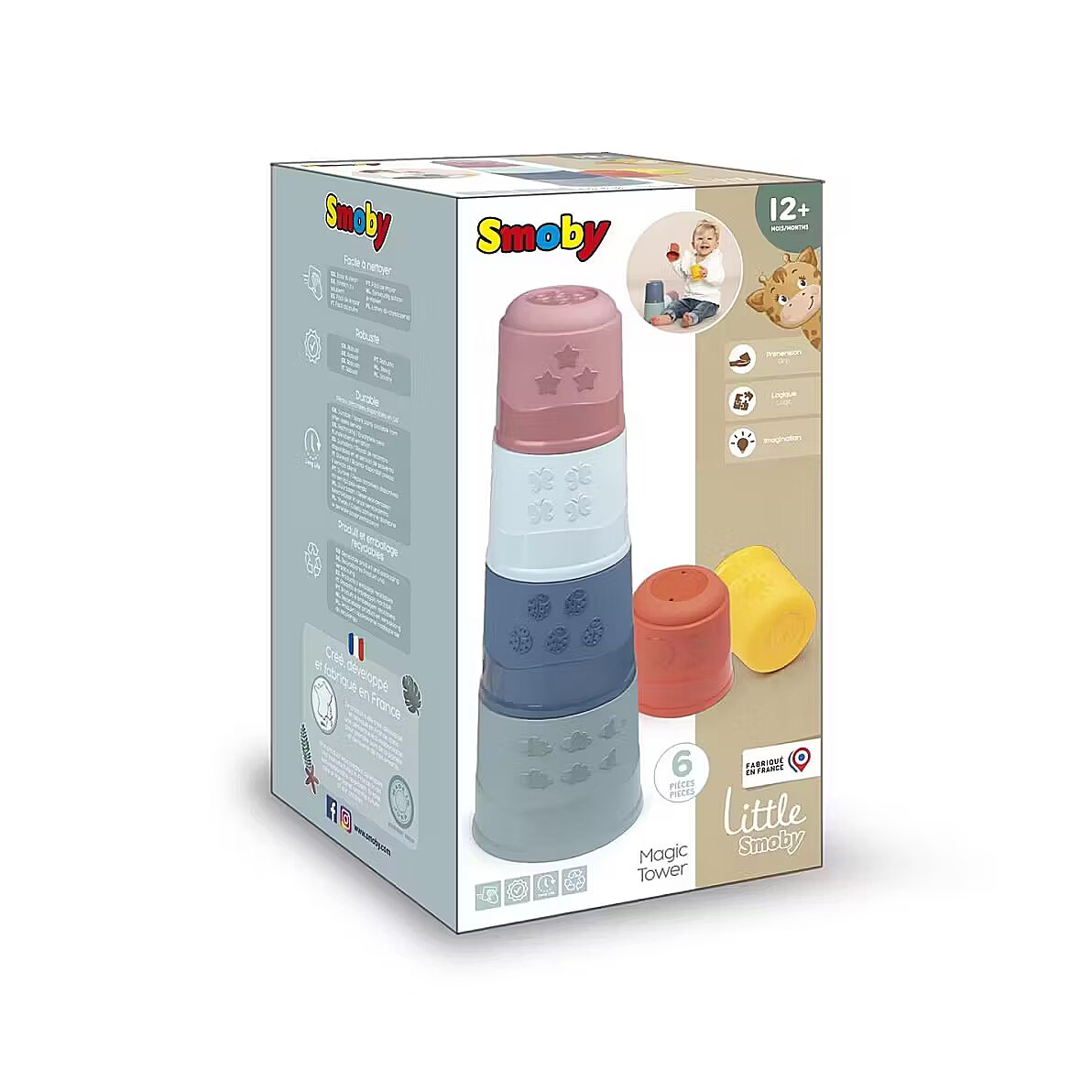 Description - Little Smoby Magic Tower With the colourful stacking pyramid from Little Smoby, even the youngest children can have lots of fun. The colourful cups can be placed inside or on top of each other and you can watch the water flow out of the cups while bathing. There are different motifs on each of the 6 different coloured cups that are waiting to be discovered. Stacking and interlocking them playfully develops fine motor skills and hand-eye coordination. At the same time, shape and colour recognition and logical thinking skills are supported. A classic among baby and toddler toys, perfect for the nursery, sandpit or at bath time.