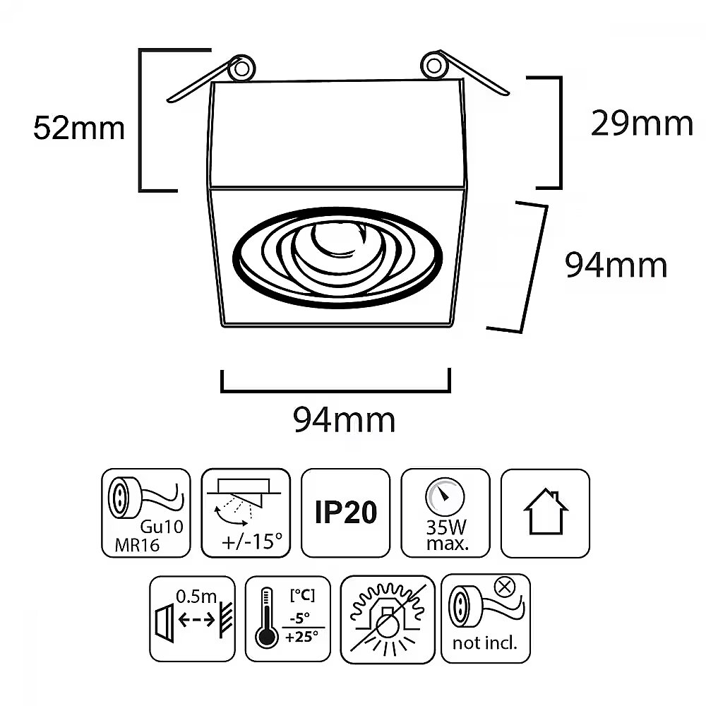 Īpašās funkcijas - Forma: kvadrātveida Materiāls: alumīnijs Gaismeklis piemērots gaismas avotiem: MR16 / GU10 Regulējams apgaismojuma leņķis: +/- 15° Aizsardzības pakāpe: IP20 Maksimāli pieļaujamais spuldzes stiprums: 35 W Gaismeklis piemērots uzstādīšanai iekštelpās Minimālais attālums no izgaismotā objekta: vismaz 1,5 m no apgaismotā objekta: 50 cm Temperatūras diapazons, kurā gaismeklis var darboties: -5°C līdz +25°C Komplektā nav iekļauta spuldzes ligzda.
