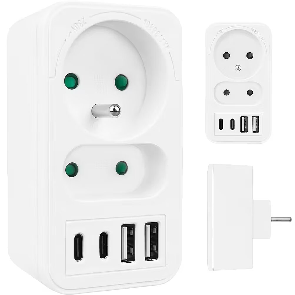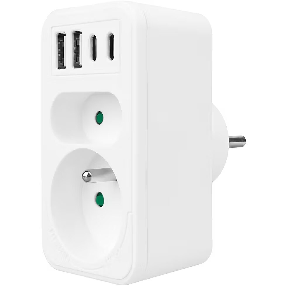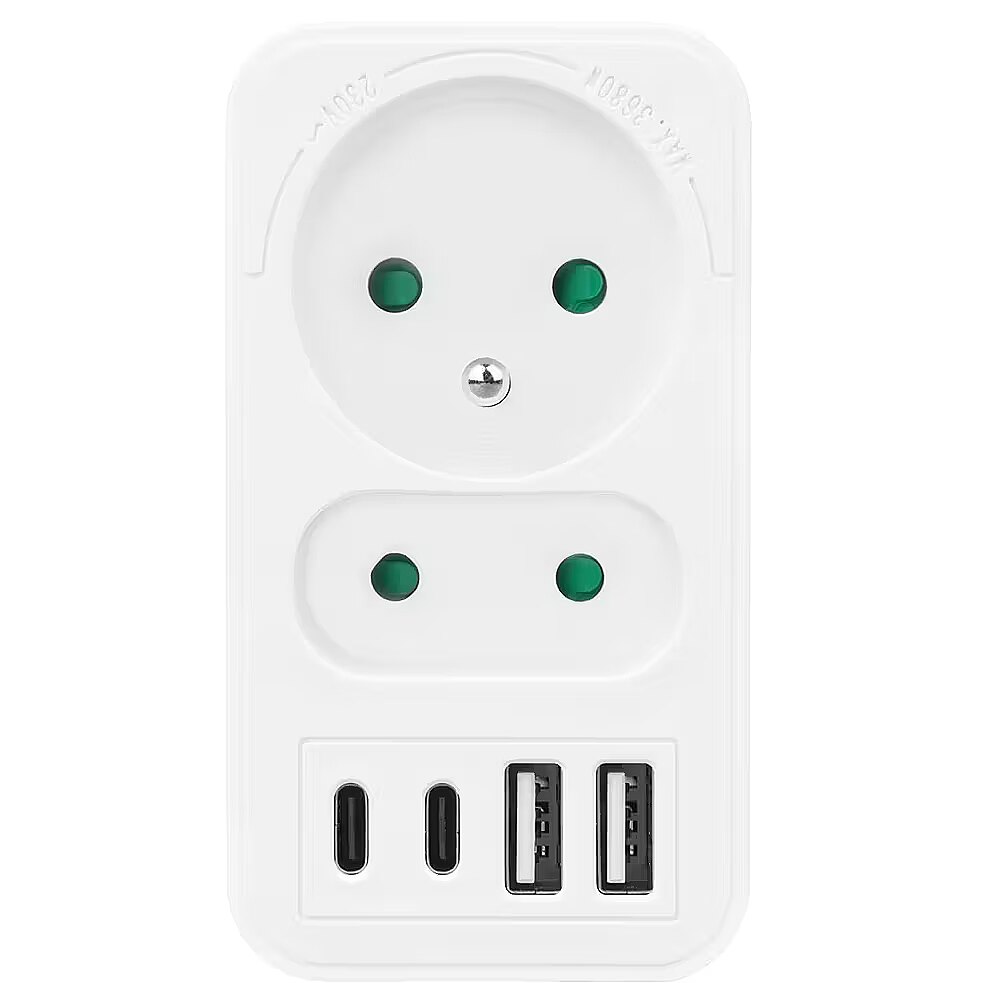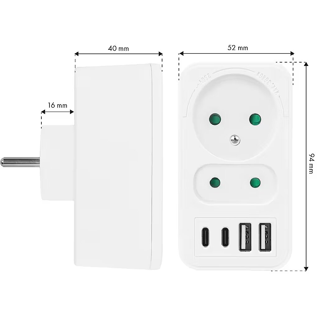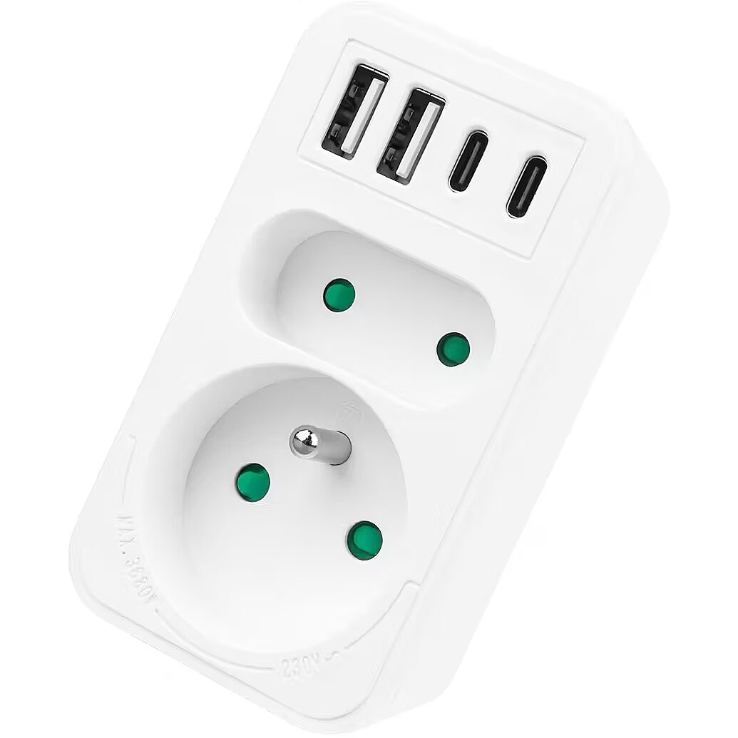 Other features - Color: white Housing material: plastic Power source (voltage): 110-240 V AC / 50/60 Hz Type of sockets: 1x flat socket (type C), 1x round socket with grounding pin (type E) Maximum load: socket C - max. current 6A 1380 W; socket E - max. current 16A 3680W USB port type: 2x USB-A, 2x USB-C USB-A output power: 5V/3A, 9V/2A, 12V/1.5A, max. 18 W (using one output) USB-C output power: 5V/3A, 9V/2.22A, 12V/1.67A, max. 20 W (using one output) Child safety feature: yes Protection rating: IP20