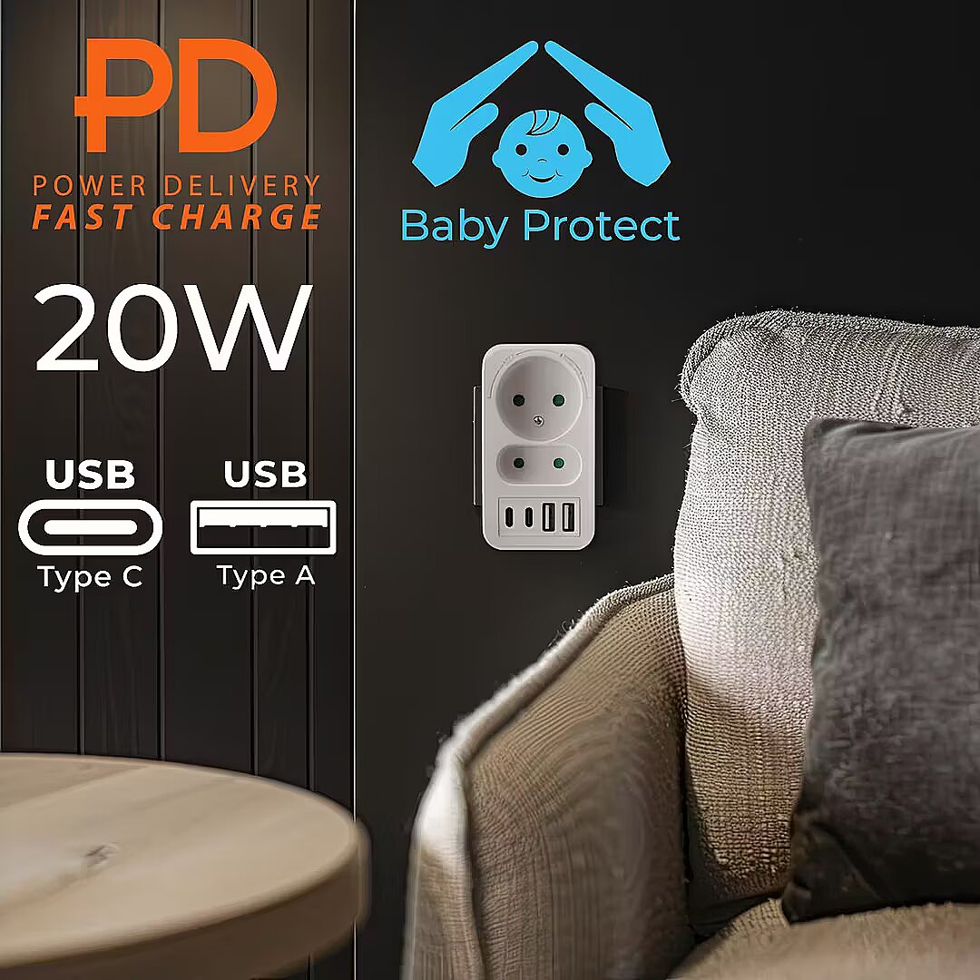 The two integrated USB Type-A ports with up to 3A (max. 18W) are perfect for charging accessories such as wireless headphones, power banks, Bluetooth speakers, and sports bands. In turn, two USB Type-C ports with Power Delivery technology (max. 20 W) ensure fast and stable charging of modern devices smartphones, tablets, portable consoles, and other devices that support the Power Delivery standard. With this combination, you can simultaneously power multiple devices with different power requirements without the need for additional chargers.