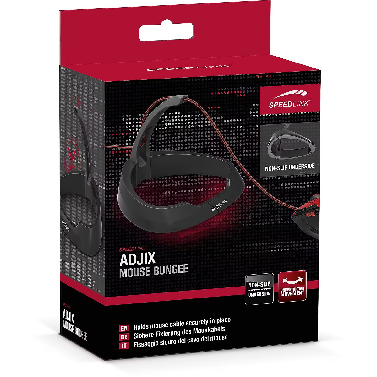 description_en - Enjoy more control at your gaming center! With the practical Adjix Mouse Bungee you can say goodbye to tangled cables and save your most important gaming tool from damage: your mouse. The flexible bungee holder also dramatically reduces cable friction and drag so you can swipe your mouse around fluidly and use every centimeter of precious mouse pad space for truly exhilarating game play. Cable management system for computer mice Holds mouse cable securely in place Minimal cable friction and drag for fluid swipes Non-slip base for total grip Maximum flexibility with incredible grip Easy cable management system