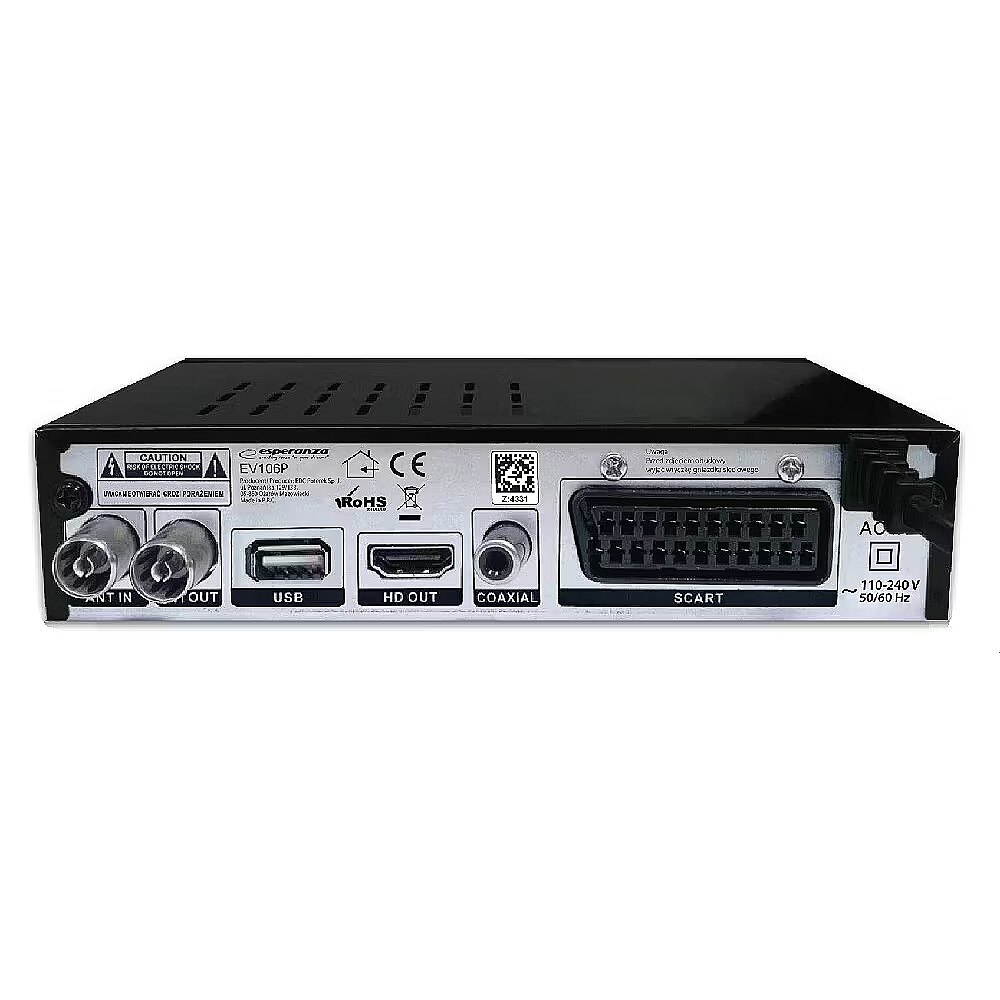 description_lv - Ražotājs: Esperanza Ražotāja kods: EV106P EAN: 5901299957790 PAMATINFORMĀCIJA: Modelis: EV106P Maksimālā izšķirtspēja: Full HD Melna krāsa TV UZŅEMŠANA: Virszemes televīzija: DVB-T un DVB-T2 Satelīta TV: Nē Kabeļtelevīzija: Nē FUNKCIJAS: Wi-Fi: Nē EPG rokasgrāmata: Jā Vairāku istabu sistēma: Nē USB ierakstīšana: Jā TimeShift funkcija: Jā HEVC saderība: Jā Attēla formāts: 4:3 un 16:9 režīms SAVIENOJUMI: Digitālo HDMI izeju skaits: 1 USB ieeju skaits: 2 Eiro savienotājs (Scart): Jā Digitālā audio izeja: koaksiālā Komponentu izvade: Nē Saliktā izvade: Nr Ethernet (LAN) savienotājs: Nr CI (kopējā saskarne): Nē Antenas ieeja: Jā LNB (satelītantena) ieeja: Nr FIZISKIE DATI: Augstums: 3,5 cm Platums: 19 cm Dziļums: 17,5 cm