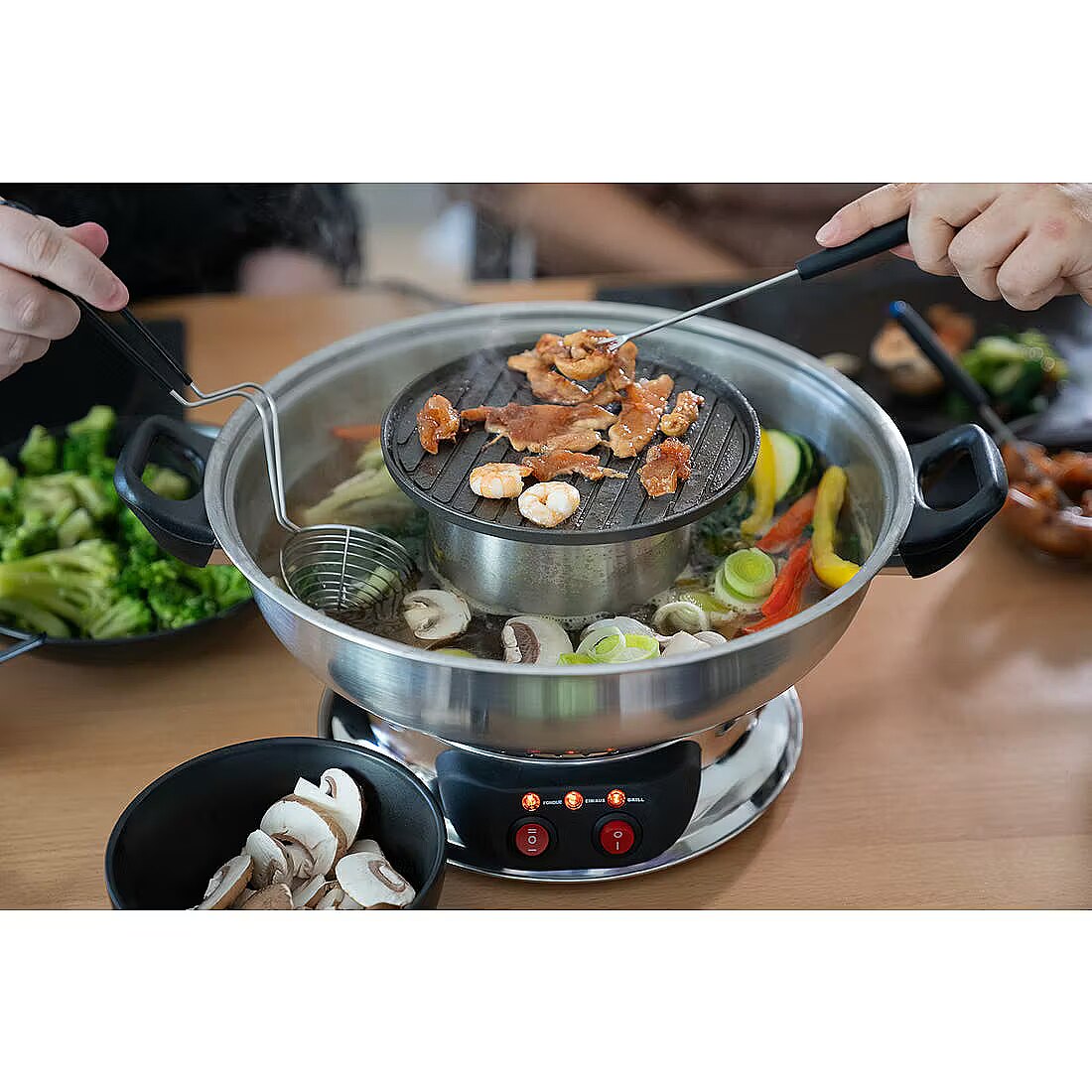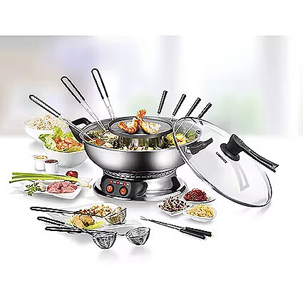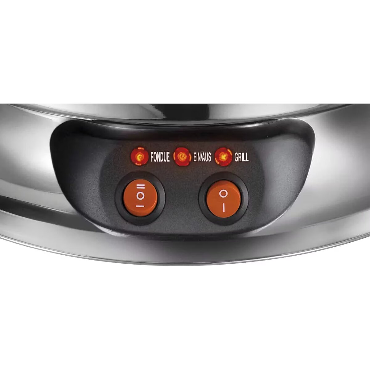LongDesc - While meat, fish or vegetables are cooking in aromatic broth in the stainless steel fondue pot, prawns or small steaks can be grilled on the removable grill plate. The fondue and grill functions can be switched on separately, and there are two temperature settings for the fondue (up to 1,950 watts). The ASIA FONDUE can be completely dismantled with a removable power cable for easy cleaning. All non-electrical parts are dishwasher safe. A glass lid, six baskets, six color-coded forks and the operating instructions with recipes are included in the delivery.