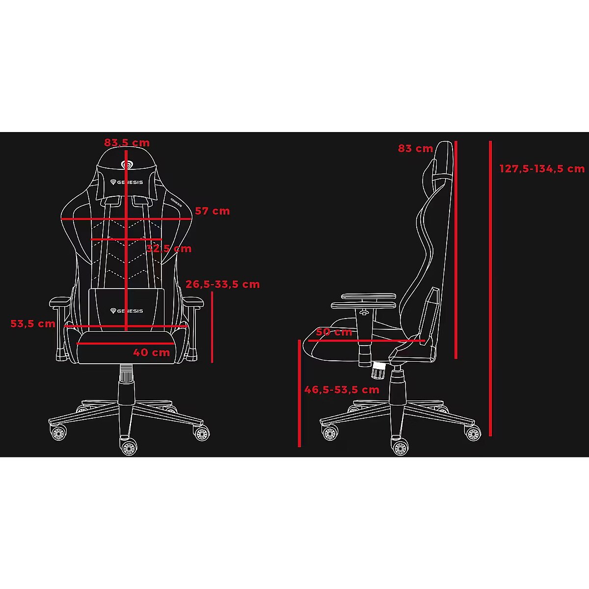 LongSummaryDescription - GENESIS Nitro 550 G2. Product type: Gaming armchair, Maximum user weight: 150 kg, Seat type: Padded seat. Height (min): 127.5 cm, Height (max): 134.5 cm, Seat width: 53.5 cm. Quantity per pack: 1 pc(s), Package type: Box
