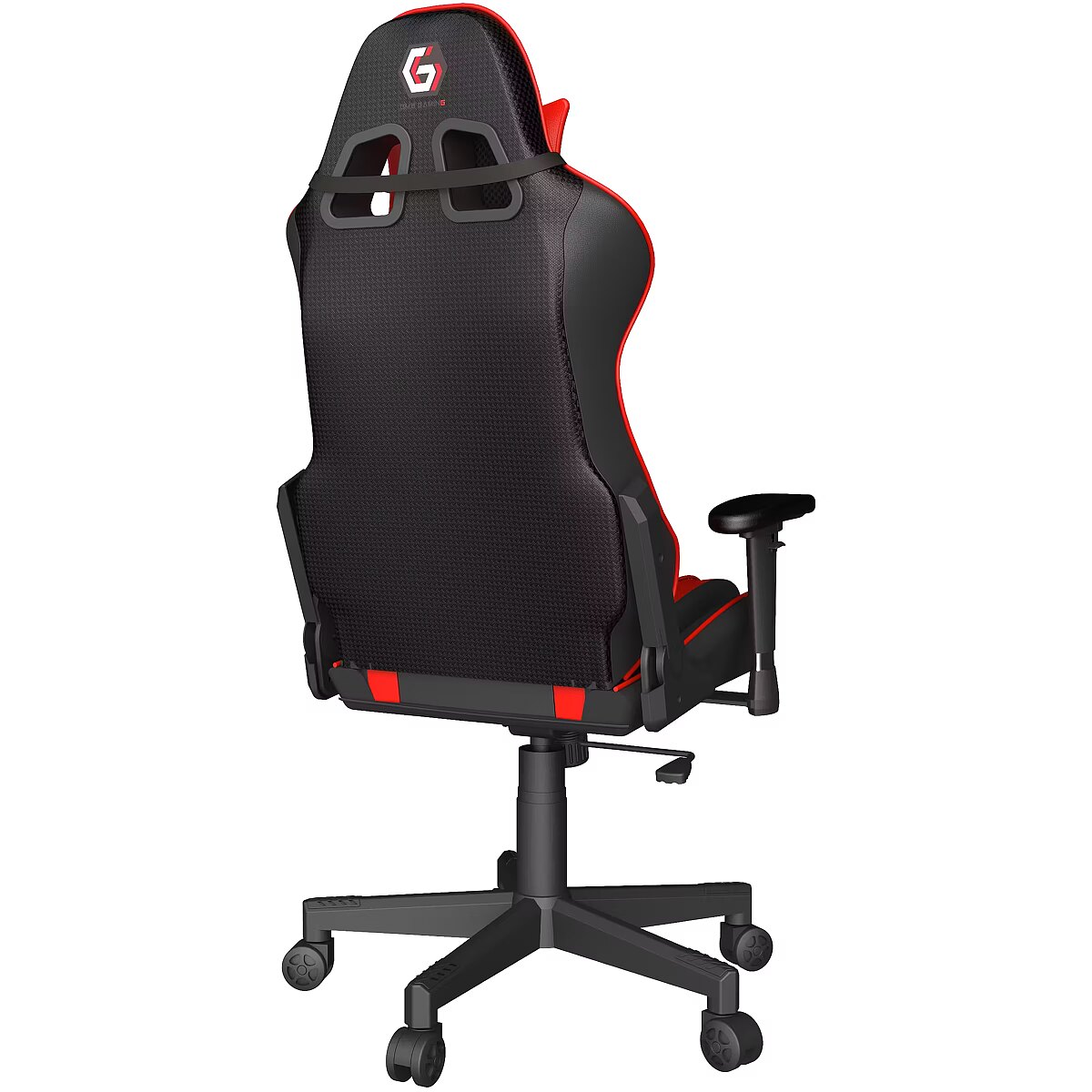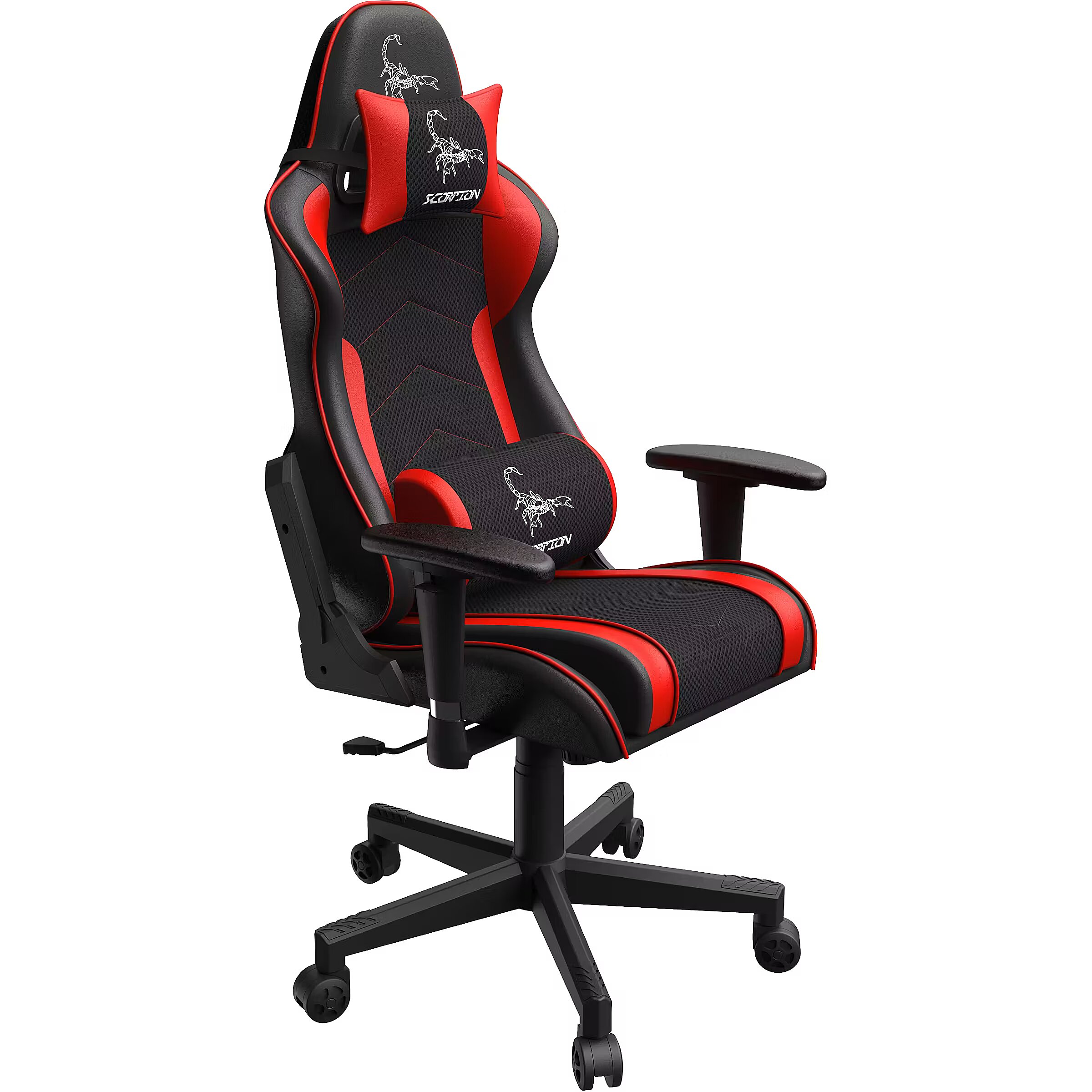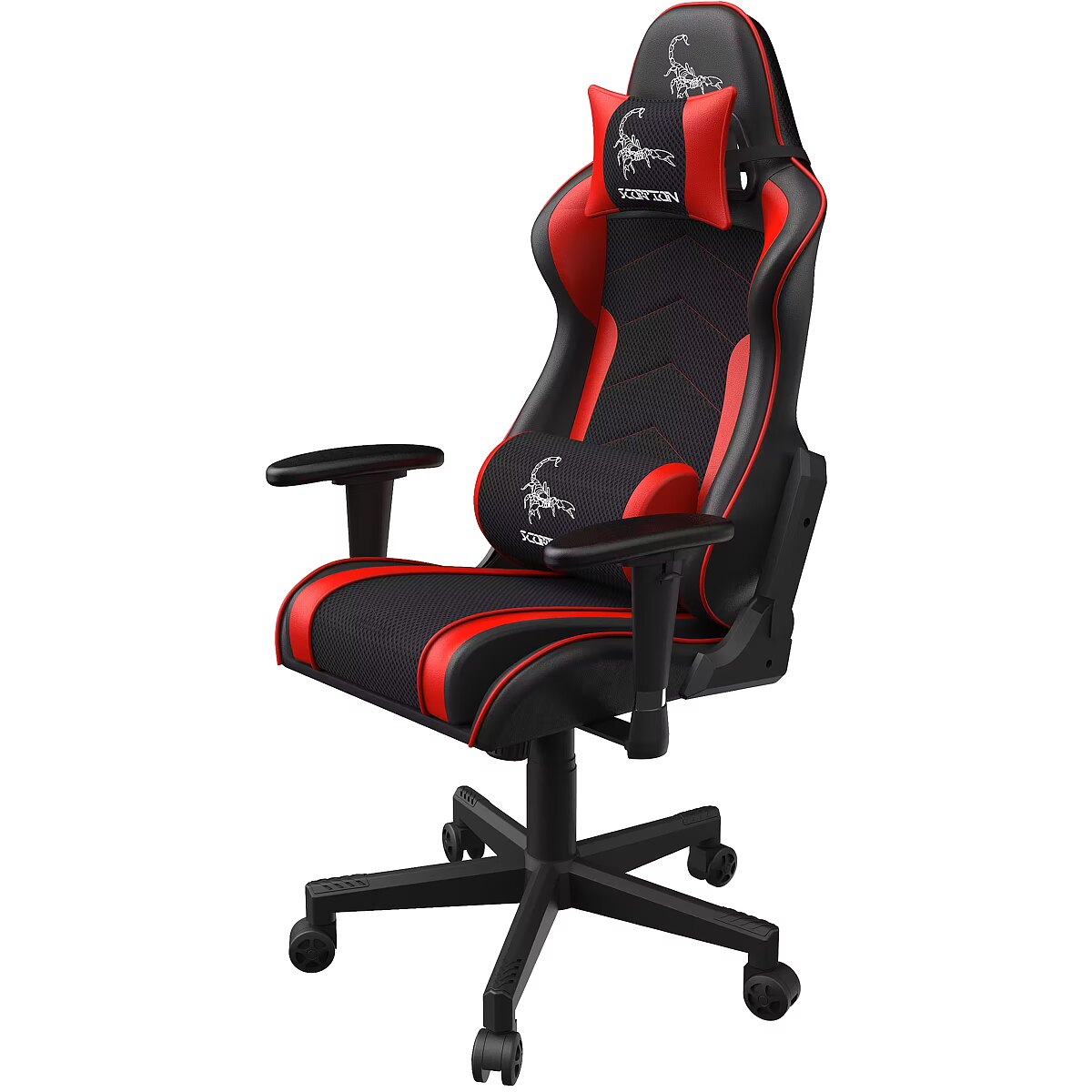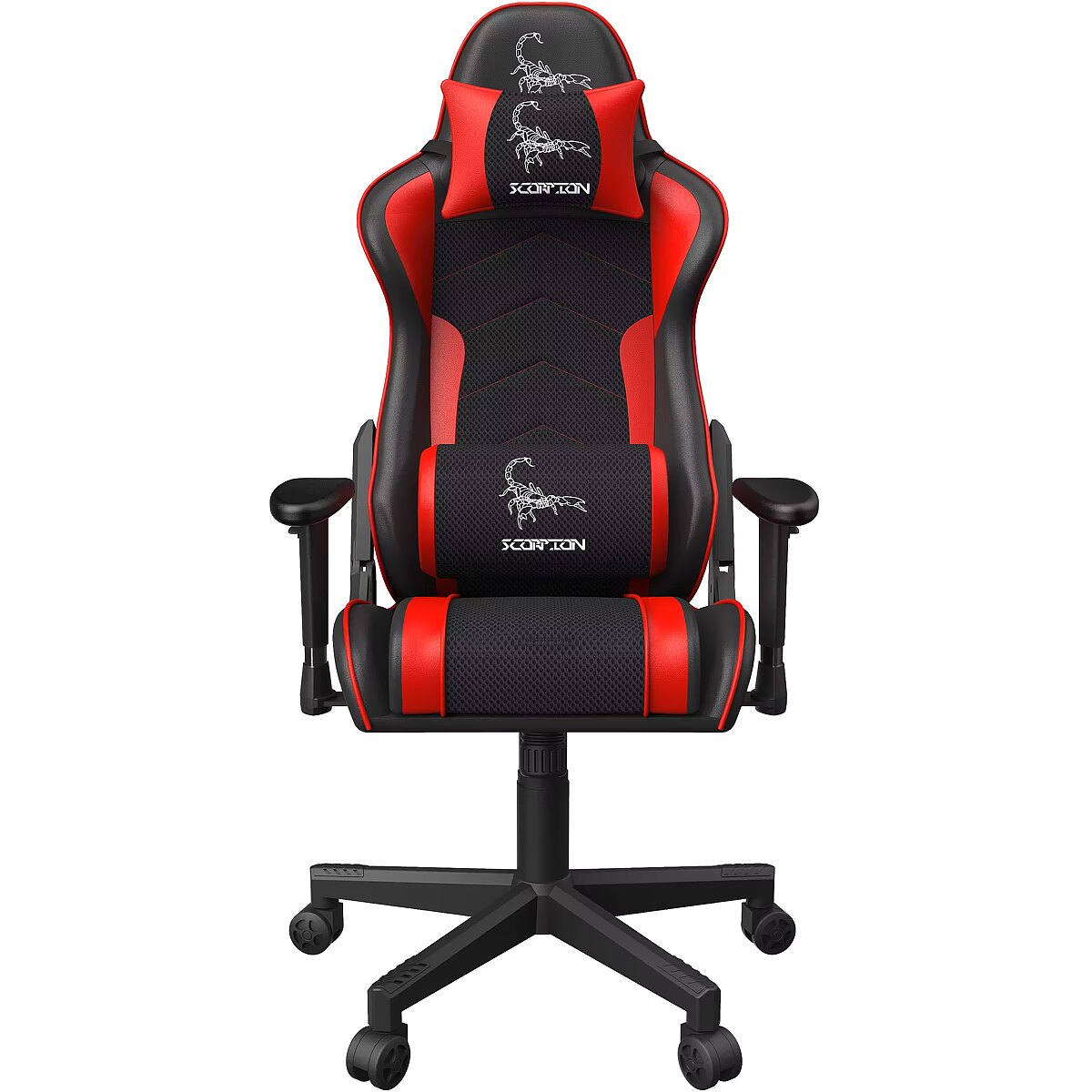 Description - Krzesło gamingowe Scorpion czarno-czerwone Krzesło komputerowe z PVC Mocna nylonowa podstawa, gąbka w oparciu i zagłówku oraz formowana pianka wewnątrz siedziska Wentylowane siateczkowe siedzisko i przód Regulowany podłokietnik 2D Mechanizm uchylny, podnośnik gazowy i koła PU