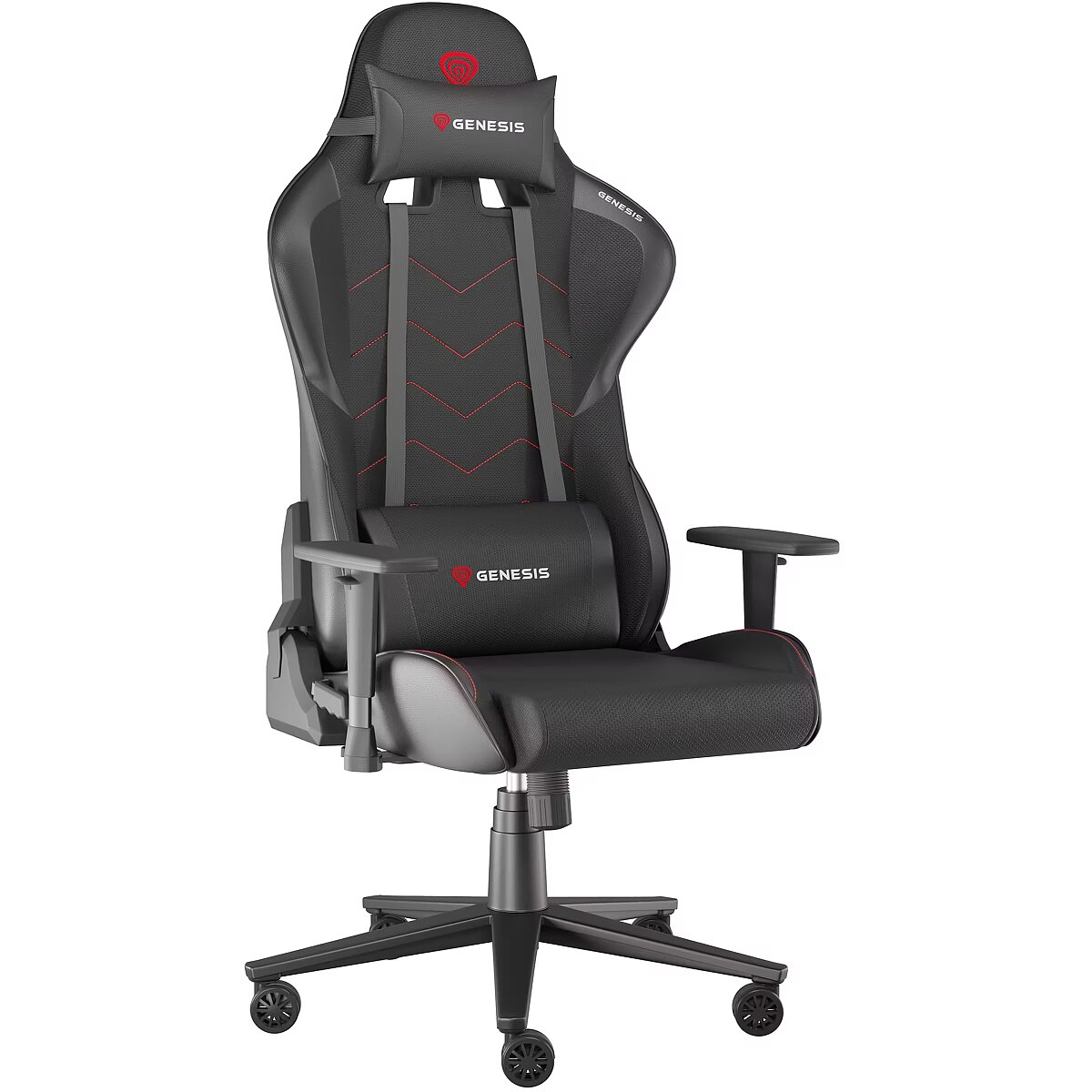 LargeDescHTML - GENESIS NITRO 330 GAMING CHAIRAtkarībā no tā lietošanas vērtības, efektivitātes un funkcionalitātes mūsdienu spēļu aprīkojumam ir jāgarantē maksimāls komforts, lai ikviens spēlētājs varētu pilnībā koncentrēties spēlei. Jaunais Genesis Nitro 330 spēļu krēsls ir izstrādāts tā, lai nodrošinātu komfortu ikvienam spēlētājam.Izturīga konstrukcijaNitro 330 krēsla rāmis ir izgatavots no augstas kvalitātes materiāliem. Tas nodrošina izturību un ilgus ekspluatācijas gadus. 3. klases gāzes pacēlājs iztur slodzi līdz 120 kg.KOMFORTĪGA APMEKLĒŠANAKrēsla polsterējums ir pildīts ar augstas kvalitātes 4,5 cm biezām putām atzveltnē un 6 cm biezām putām sēdeklī. Turklāt gan sēdekļa, gan atzveltnes forma ir veidota tā, lai nodrošinātu maksimālu komfortu un atbalstu spēlētāja mugurkaulam.Krēsls ir pārklāts ar matētu, izturīgu neilona materiālu un augstas kvalitātes eko ādu. Sēdekļa audums ir stepēts un trīskārši sašūts, kas ne tikai garantē krēsla apdares izturību, bet arī izceļ tā unikālo dizainu.FUNKCIONALITĀTE Nitro 330 nozīmē ne tikai maksimālu komfortu un materiālu kvalitāti. Krēsla dizaineri ir pievērsuši lielu uzmanību arī tā funkcionalitātei. Tādi risinājumi kā regulējams sēdekļa augstums, slīpuma funkcija, 360 grādu rotācija un neilona riteņi ievērojami palielinās lietotāja apmierinātību.Papildu spilvens ar regulējamu augstumu ļauj spēlētājam vienkārši regulēt tā, lai tas atbilstu optimālajai mugurkaula vietai.ROKŠU balstiGenesis Nitro roku balsti ir apdarināti ar mīkstiem, ērtiem spilventiņiem, kas ir papildus pārklāti ar pulverkrāsu, kas novērš elkoņu slīdēšanu, kamēr spēlētājs savu svaru noliek uz roku balstiem. Optimāls apakšdelmu komforts ir ļoti svarīgs ilgstošai spēlēšanai.