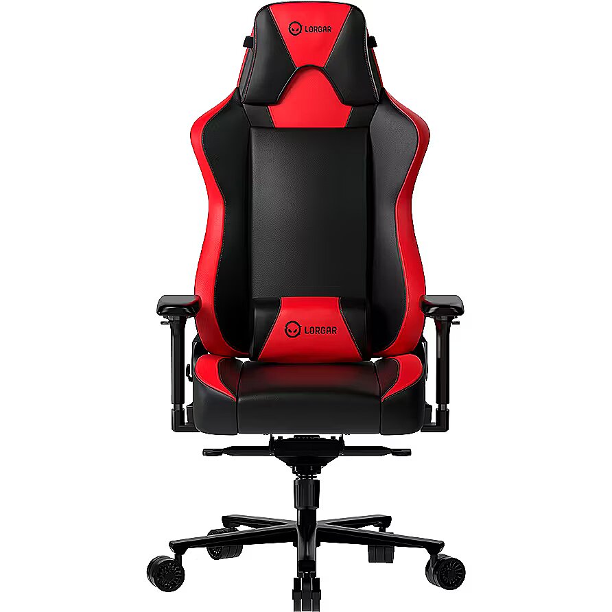 ProductDescription - LORGAR Base 311, Gaming chair, PU eco-leather, 1.8 mm metal frame, multiblock mechanism, 4D armrests, 5 Star aluminium base, Class-4 gas lift, 75mm PU casters, Black + red