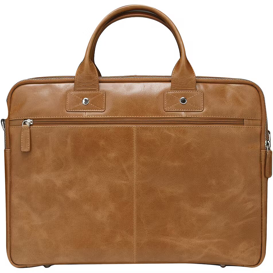 Īss kopsavilkums - Šī dbramante1928 Kronborg pilngraudainas ādas soma ar elegantām, modernām līnijām un klasisku, plānu dizainu ir ar diviem noapaļotiem ādas rokturiem, noņemamu plecu siksnu un dubultu rāvējslēdzēja aizdari. Plašajā iekšpusē, kas sadalīta divās atsevišķās rāvējslēdzēja aizdares daļās, ir vairāki glabāšanas nodalījumi, tostarp polsterēta zona, lai aizsargātu jūsu datoru vai Macbook. Priekšpusē ir vēl viena rāvējslēdzēja aizdares kabata, un atvērta aizmugurējā kabata kalpo kā ratiņu turētājs un/vai papildu uzglabāšanas vieta.