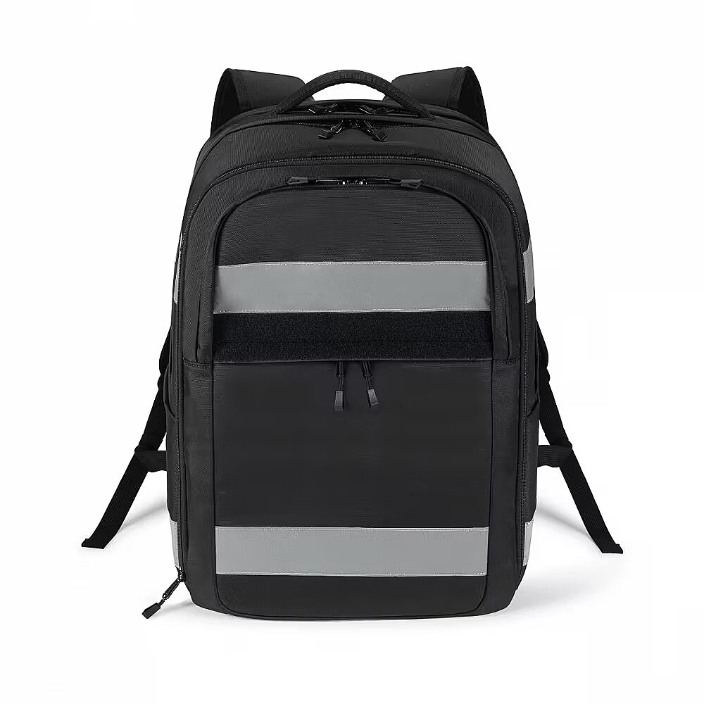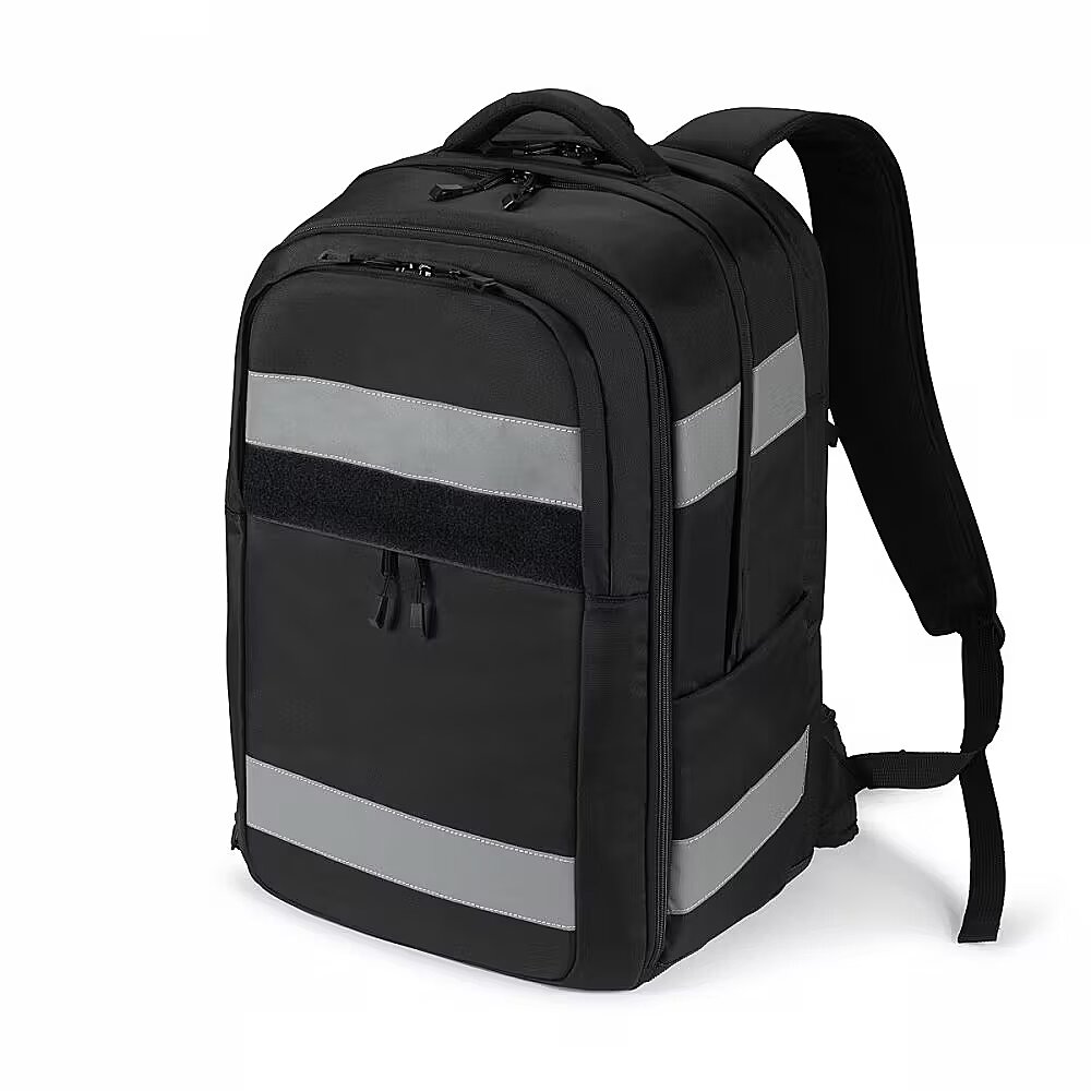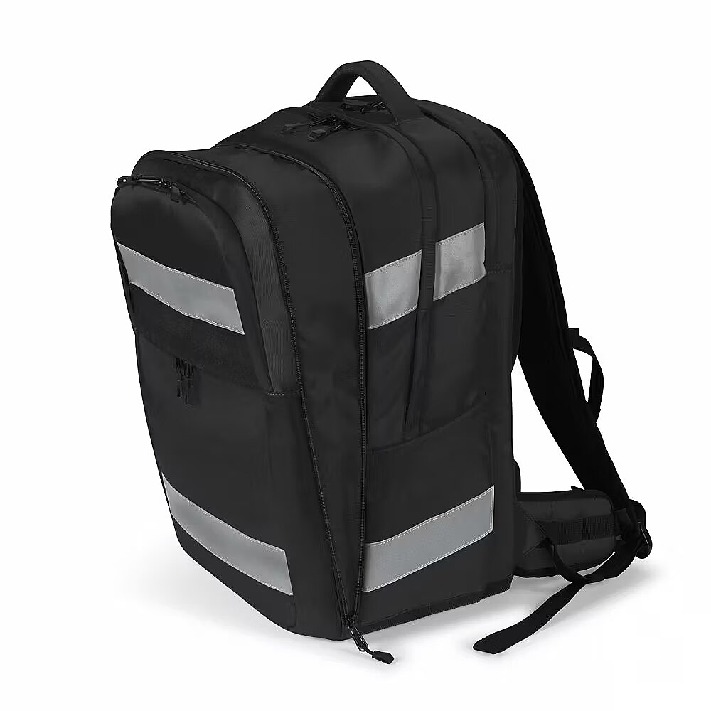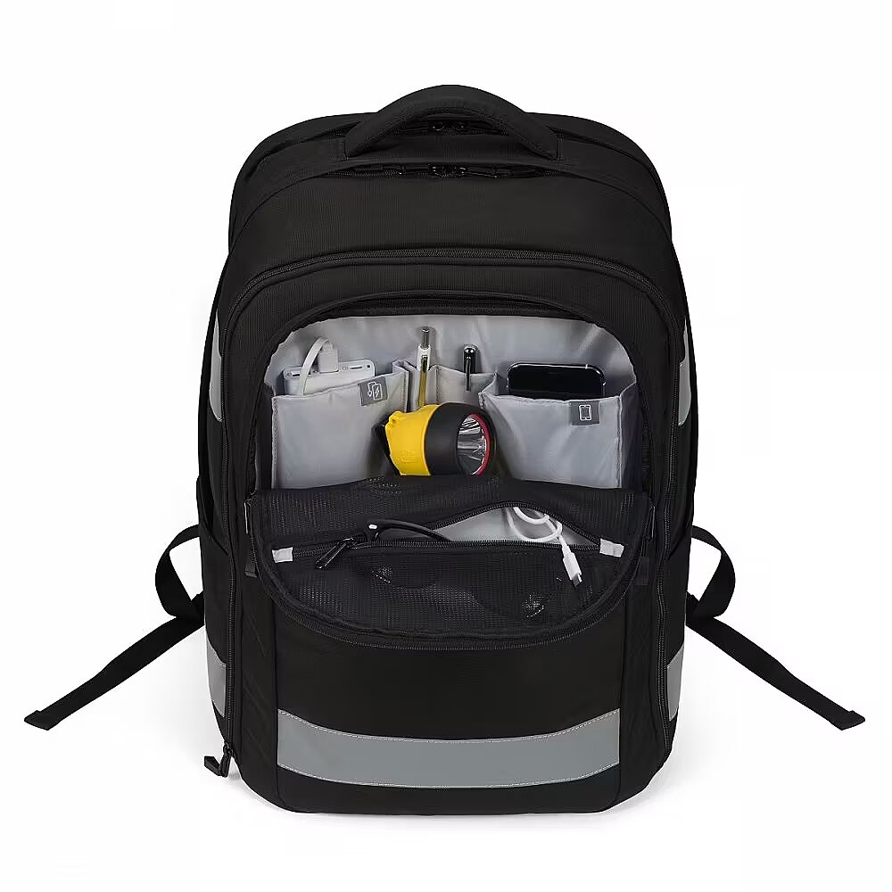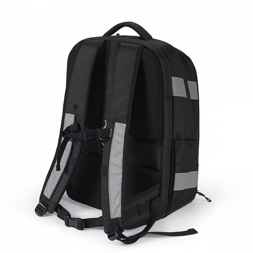 Description - 17.3 inch Reflective laptop backpack 32-38l Safety at work is paramount, and with the right equipment, accidents can be avoided. The EN ISO 20471:2013 standard guarantees workers optimal visibility when wearing emergency clothing. In addition, when working outdoors for several days, you can safely and conveniently transport many work equipment such as spare clothing, helmets, gloves and personal items. Highly visible DICOTA backpacks are a reliable solution for everyday, demanding work outdoors. All products meet important criteria such as ergonomics, durability and sustainability. The highest quality and functionality meet ecological materials made of recycled PET bottles - at the same time protecting employees and the environment. Thanks to the use of fluorescent materials and 3M reflective strips in accordance with the EN ISO 20471:2013 standard, the backpacks provide excellent visibility, thus improving work safety in outdoor areas such as construction sites, forests, during rescue operations and on the way to work. The outer material is waterproof to EN ISO 4920 Level 4 and the included rain cover provides additional protection in heavy rain. The air flow system at the back guarantees pleasant air circulation when the temperature rises. Adjustable hip and chest straps ensure comfortable weight distribution and optimal ergonomics. Thanks to its large storage space, the backpack is ideal for outdoor use and can be expanded from 32 to 38 liters, giving you enough space for a change of clothes or workwear. They can be stored separately from other contents. The notebook is maximally protected thanks to the proven Fit-all system. There are also compartments for tablets, smartphones, power banks, flashlights, etc. and universal compartments with a zipper. Valuable items can be safely stored in the rear storage compartment, thus protecting them against theft. The backpack can be personalized with a name or logo patch, using the business card pocket on the back and the Velcro area. The REFLECTIVE backpack with a capacity of 32-38 liters provides maximum space, comfort and visibility and is perfect for a demanding day of work outdoors. It also improves occupational safety and helps prevent accidents.