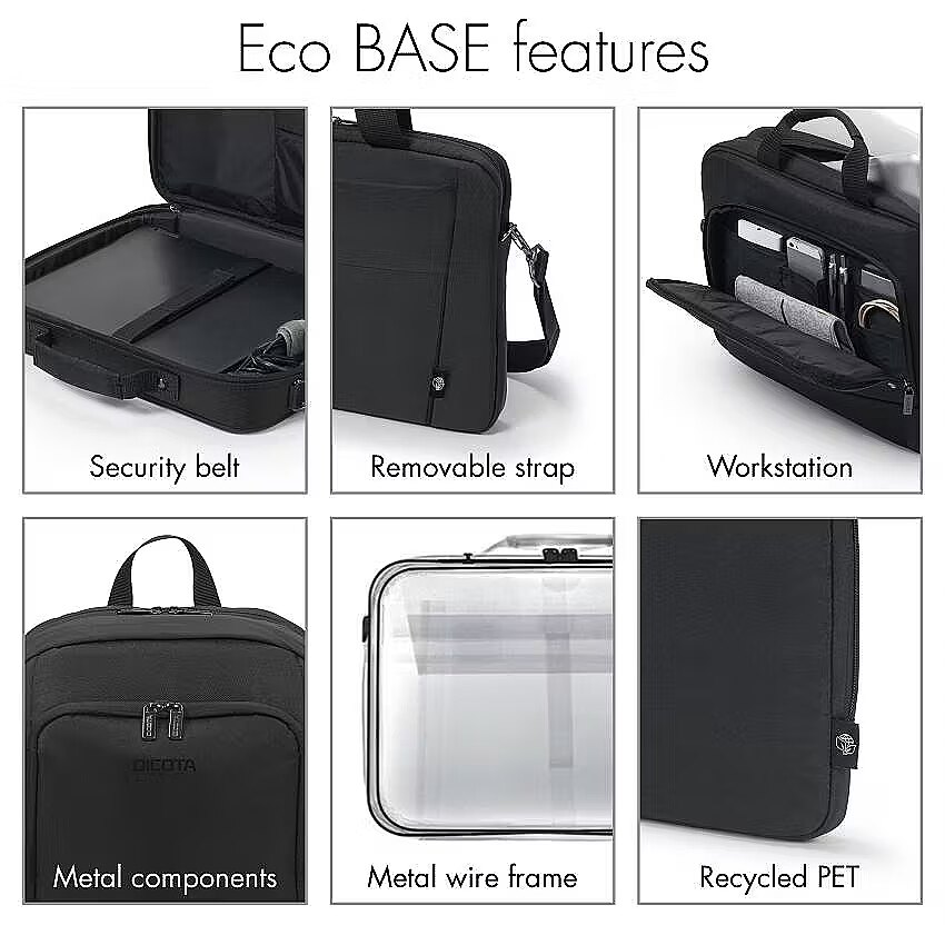 Description - Dzisiejsze działania kształtują świat jutra. Dlatego w DICOTA poświęcamy się opracowywaniu przyjaznych dla środowiska rozwiązań i dlatego wszystkie produkty w naszych kolekcjach ECO wykonujemy z ekologicznego PET pochodzącego z recyklingu. Ponownie wykorzystujemy do 19 butelek PET, dzięki czemu otrzymasz produkt przyjazny dla środowiska z dożywotnią gwarancją. Nasze produkty PET mają również jakość, wygląd i wykończenie, które znasz i lubisz. Kompaktowa obudowa Eco Multi BASE zapewnia idealną ochronę dla Twojego laptopa dzięki wyściełanej komorze na notebooka. Etui w pełni chroni urządzenia o wielkości od 15 do 17,3 , a elastyczny pasek zabezpiecza je również w komorze. Eco Multi BASE gwarantuje dodatkową stabilność i ochronę dzięki metalowej ramie, a także elastyczną mobilność dzięki lekkiej konstrukcji. Twój smartfon lub inny mniejsze przedmioty, takie jak kable, długopisy czy ładowarki, można przechowywać w wygodnej przedniej kieszeni, dzięki czemu są zawsze pod ręką. Uchwyty etui ułatwiają przenoszenie i można je przymocować do walizki w kilka sekund za pomocą wbudowanego paska. można go również nosić za pomocą regulowanego paska na ramię, dlatego Eco Multi BASE jest idealna dla Ciebie, jeśli jesteś w ciągłym ruchu i chcesz wesprzeć recykling butelek PET dzięki ekologicznemu etui. Wykonane z 10 przetworzonych butelek PET Wyściełana komora na notebooka Metalowa rama dla dodatkowej ochrony Wysokiej jakości metalowe elementy Pasek zabezpieczający notebook Kieszeń na dokumenty z tyłu Przednia kieszeń z miejscem do przechowywania akcesoriów mobilnych Wygodny, wyściełany uchwyt Odpinany, regulowany pasek na ramię