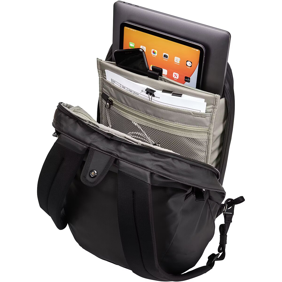 Technical details > Other features - Store daily essentials while protecting a 14" laptop in a padded, elevated pocket and a tablet or files in a dedicated slip pocket; Contents remain secure in main compartment with concealed zippers, a back-facing opening, and a snap flap that closes over the zipper for added security