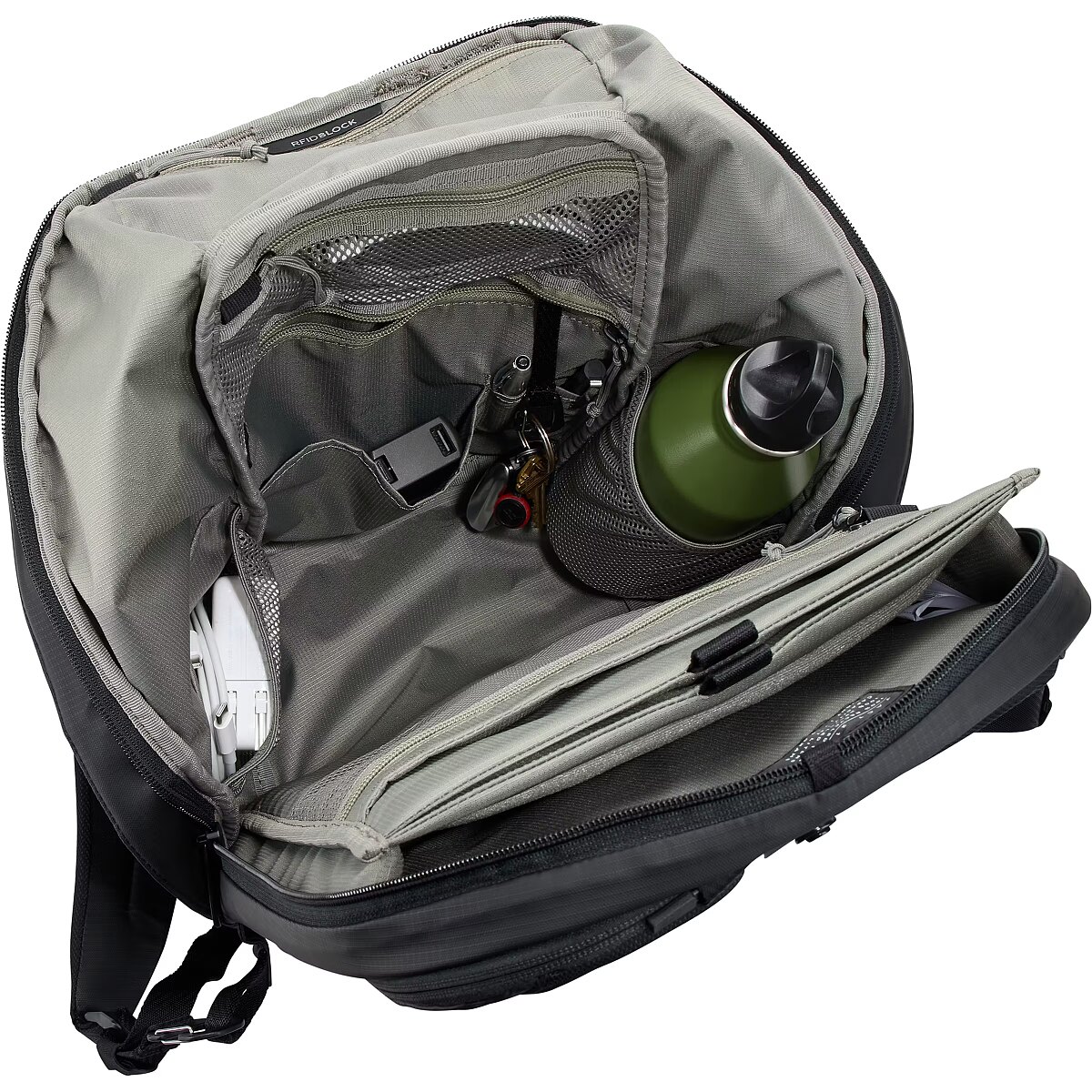 Tehniskā informācija > Citas funkcijas - Uzglabājiet ikdienā nepieciešamās lietas, vienlaikus aizsargājot 14" klēpjdatoru polsterētā, paaugstinātā kabatā un planšetdatoru vai failus speciālā iešļūktā kabatā; saturs paliek drošībā galvenajā nodalījumā ar slēptiem rāvējslēdzējiem, uz muguras vērstu atvērumu un aizdares atloku, kas aizveras virs rāvējslēdzēja, lai nodrošinātu papildu drošību.