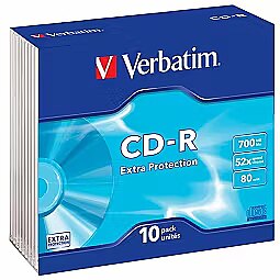Tehniskā_details - CD-R ir ierakstāms disks ar 700 MB ietilpību. Atbilst Orange Book II daļas 3. versijas specifikācijām. Verbatim datu nesēja "mehāniskās specifikācijas" ir ļoti precīzas, un uz tā ierakstītos datus var nolasīt dažādos diskdzinējos. Rezultātā Verbatim diski ir ļoti saderīgi ar dažādiem diskdzinējiem, kas darbojas ar dažādiem ātrumiem. Izcila izturība pret UV starojumu. Arhīva kalpošanas laiks: Īpaša aizsardzība - līdz 40 gadiem; AZO - līdz 100 gadiem. Viszemākais kļūdu īpatsvars pret dažādiem CD ierakstīšanas iekārtām. Extra Protection virsma ir balta virsma, kas nodrošina papildu aizsardzību neaizsargātajai etiķetes pusei. Uz tās var rakstīt ar CD/DVD marķiera pildspalvu. Nesēja Tips CD-R Nesēju skaits 10 gab Kapacitāte Darbības laiks 80 min(s) Ierakstīšanas ātrums 52 Skaits (nodalījumi) Iepakojums Slim Case