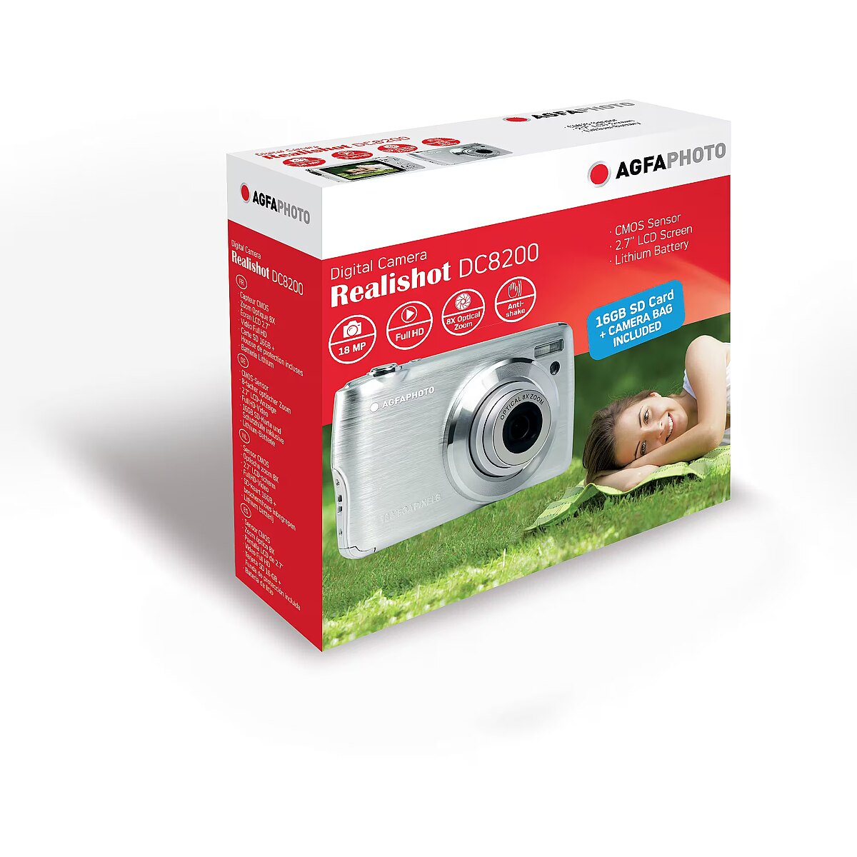 description_en - The light and compact AgfaPhoto DC8200 is the perfect companion wherever your adventures take you – the camera fits comfortably in a handbag or even a pocket. However, the small body hides powerful contents: 18-megapixel CMOS sensor, 2.7-inch TFT LCD screen and 8× optical zoom. The camera allows Full HD 1920 × 1080 video recording, and the 18-megapixel sensor ensures clear and sharp images. 18-megapixel CMOS sensor 8× optical zoom Full HD 1920 × 1080 video recording 2.7 inch TFT LCD screen Kit includes a 16 GB SDHC memory card and a case