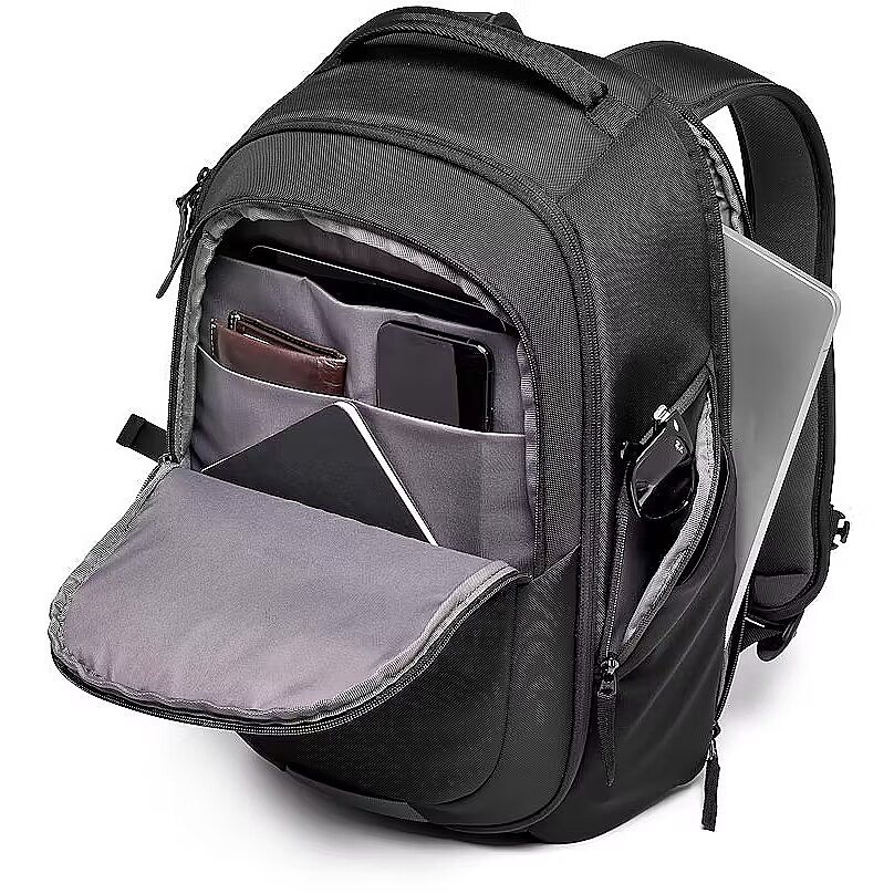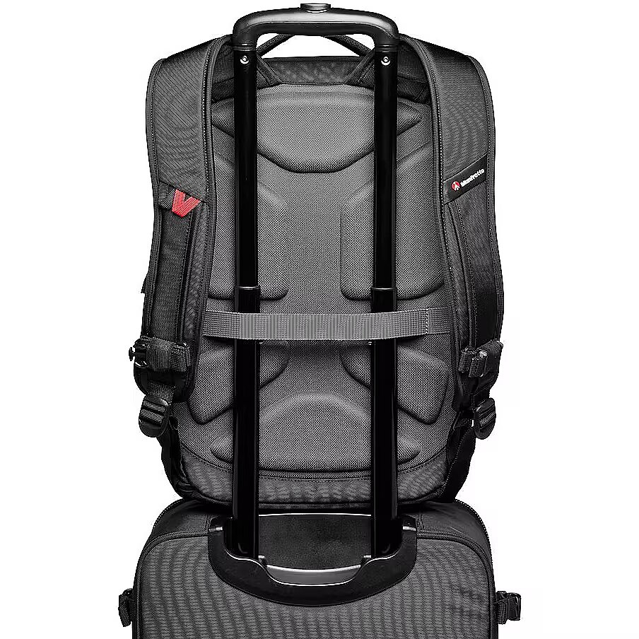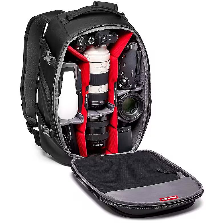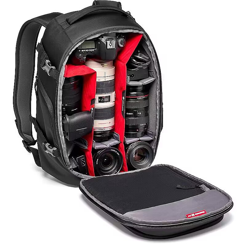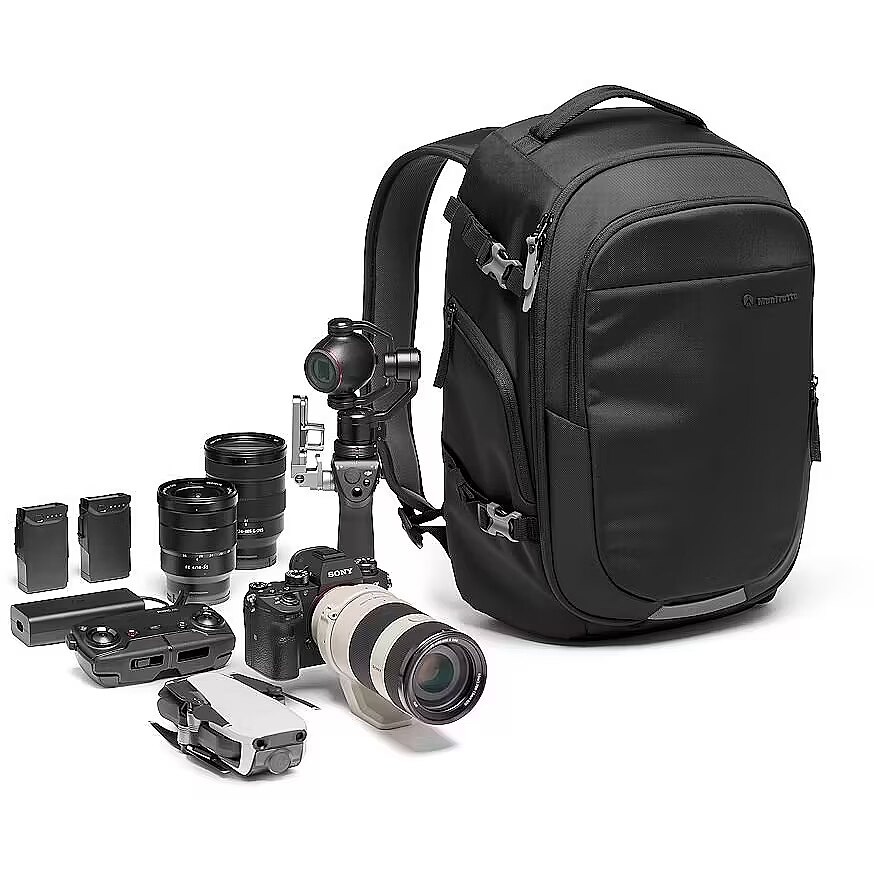 description_en - Compact and functional camera and laptop backpack entirely dedicated to camera gear. The Manfrotto Advanced Gear Backpack M III for DSLRs and CSCs is an innovative bag that generously stores and carries your camera and laptop gear, but remains lightweight, compact and easy to carry. It safely stores a DSLR with a 70-200 mm f/2.8 lens attached, as well as 4 additional lenses, or can be used equally well to carry a full-frame CSC camera with 70-200/4 lens attached plus 2-3 additional lenses as well as a DJI Mavic Air 2 kit. It includes a dedicated 15 inch padded laptop pocket, easy to reach when you’re on the move. The padded camera compartment features the brand-new Manfrotto M-Guard™ Protection System. Made of special high-density EVA foam, it provides exceptional shock absorbing response with a super slim profile. The customizable folding patterns allow maximum versatility to fully protect camera gear while maximizing the use of space. You can easily open the convenient zippered front compartments fully to quickly access whatever you need. A travel size tripod can be attached to the side with the strap. Thanks to its size, strength, versatility and its large pockets, you can organise your gear with ease. In addition, the bag is equipped with an additional front pocket for organizing personal belongings and small accessories. All external fabric are treated making the bag water repellant which can be further reinforced by the supplied raincover in case of adverse weather conditions. Compact and spacious but lightweight camera backpack Fits full frame DSLR with 70-200/2.8 lens + additional lenses Entire storage space for camera gear keeps everything protected Access all your gear through one front door Dedicated 15" padded laptop compartment padded for protection