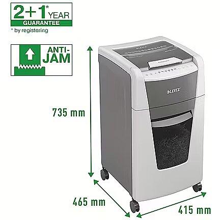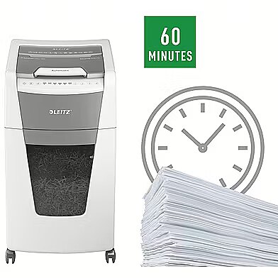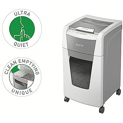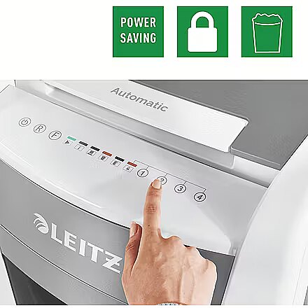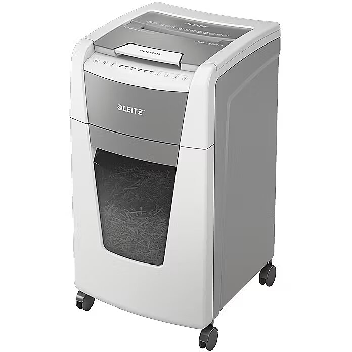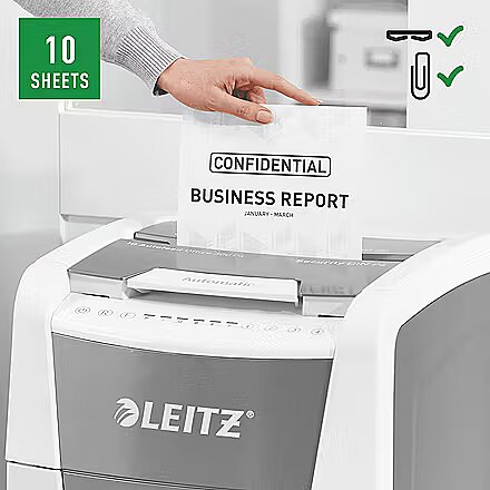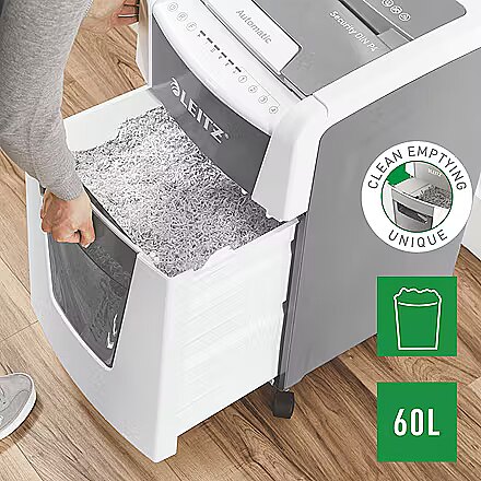 LongDesc - Fully automatic paper shredder from Leitz with unique clean emptying feature. So intelligent it quietly works on its own, just insert your stack of papers (incl. staples & paper clips), close the lid and get on with your day. Ideal for office use. Confidential security and excellent performance with this anti jam, quiet and long running (60 min) autofeed shredder. Automatically shred 300 sheets of A4 into security P4 (4x28mm) cross cut pieces in one go into the generous 60L bin. Simple operation using touch controls.