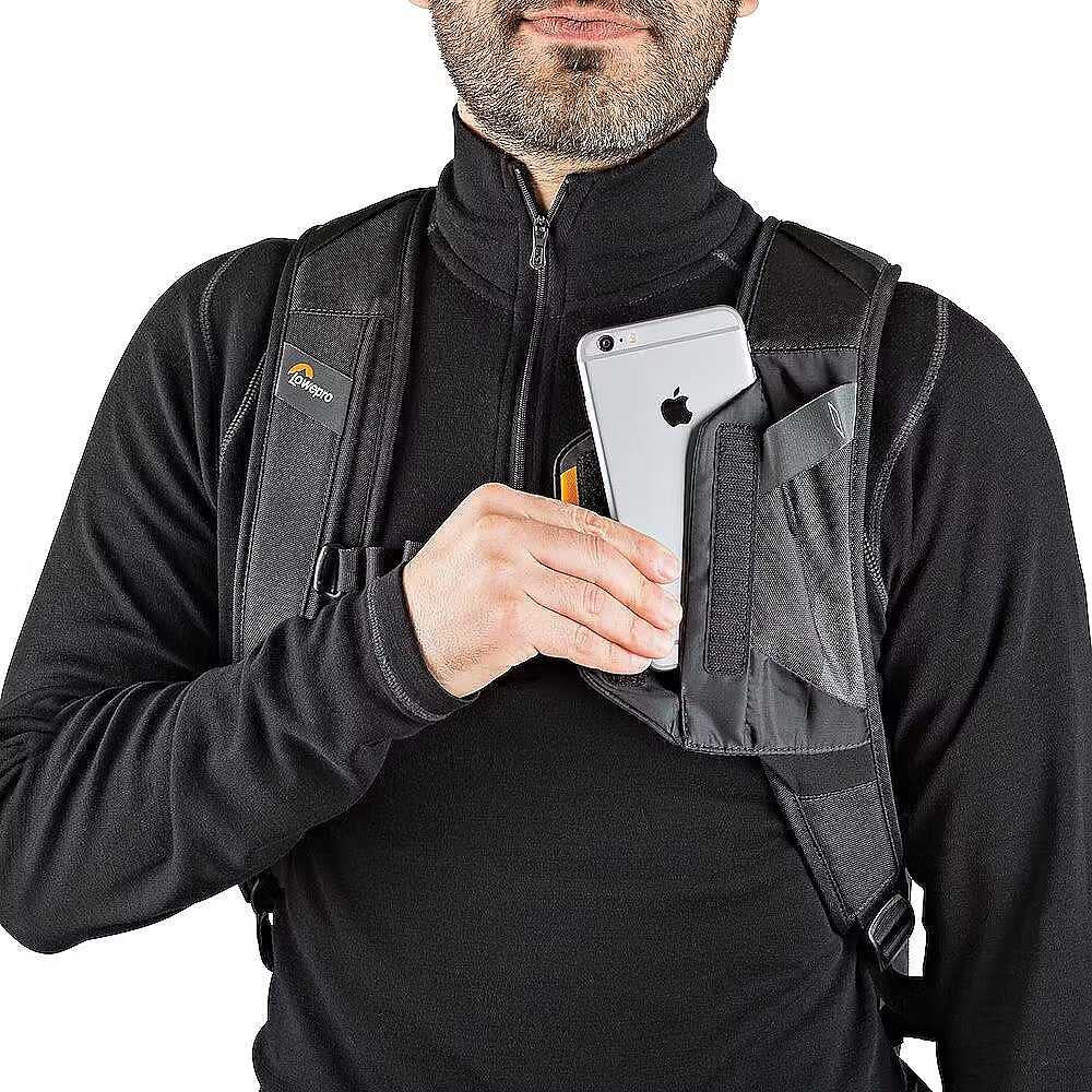 PhoneZone shoulder strap pocket holds up to plus size smartphones and allows fast access while wearing the pack. Targeted lightweight protection