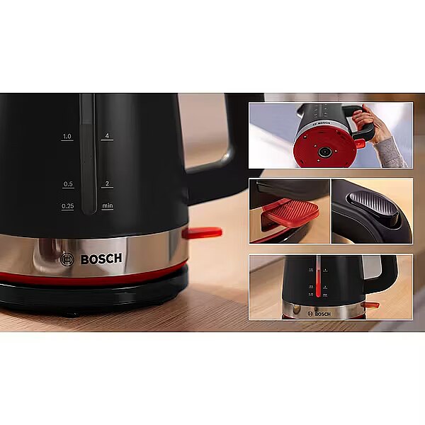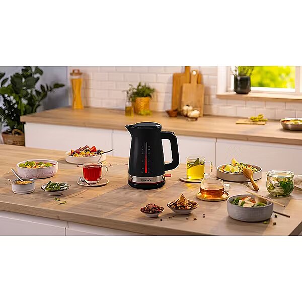 LongSummaryDescription - Bosch TWK4M223. Ūdens tvertnes tilpums: 1,7 L. Jauda: 2400 W. Izstrādājuma krāsa: melna, Korpusa materiāls: Ūdens līmeņa indikators, Pārkaršanas aizsardzība. Bezvadu