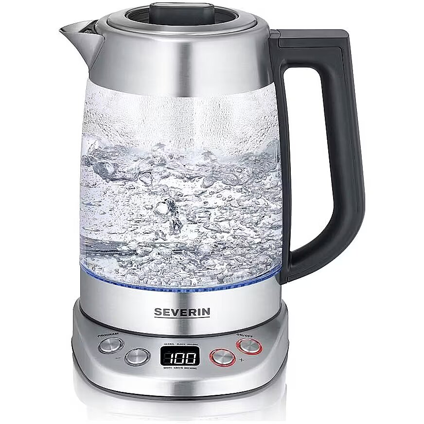MediumApraksts LV - Tējas un ūdens tējkanna ar nerūsējošā tērauda smalku sietiņu tējas filtru, ar rokturi papildu drošībai. Atsevišķas temperatūras un mērcēšanas laiki - temperatūras līmeņu izvēle no 40 °C līdz 100 °C 5 °C pakāpēs (mērcēšanas laiks no 1 līdz 15 minūtēm). - "Easy Tea Select" funkcija: 5 iepriekš iestatītas tējas programmas ar atbilstošu mērcēšanas laiku un ātras ūdens vārīšanas funkciju - Fast-Boil-Power: 3000 W jauda paātrinātai karsēšanai, sasniedzot vārīšanās temperatūru par 30 % ātrāk* - Automātiskā karstuma uzturēšanas funkcija uztur dzērienus siltus vismaz 30 minūtes - Ietilpība: aptuveni 1,7 l ūdens, aptuveni 1,5 l tējas - Augstas kvalitātes korpuss no nerūsējošā tērauda un termisko triecienu izturīga stikla - Augstāka temperatūras precizitāte, pateicoties jutīgajam iebūvētajam temperatūras sensoram - Signāla signālus pēc vēlēšanās var izslēgt/aktivizēt *Līdzinās SEVERIN WK 3473