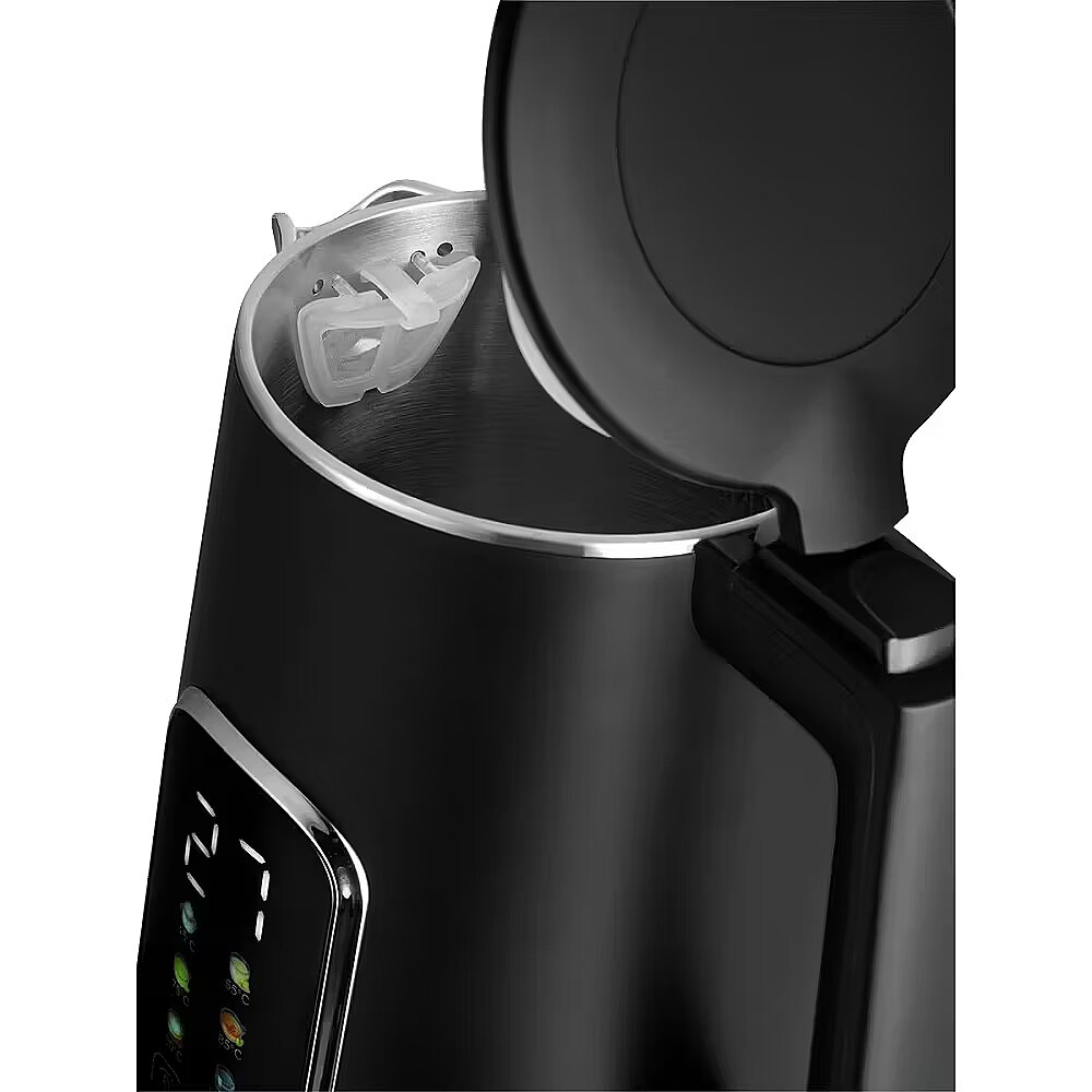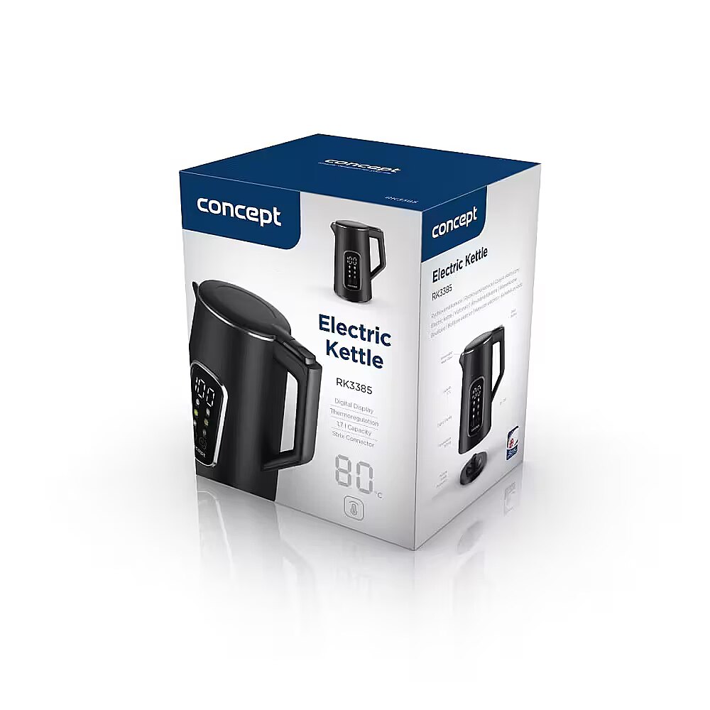 Apraksts - Elektriskā tējkanna ar temperatūras regulēšanu 1,7 l RK3385 Digitālais displejs ar temperatūras regulēšanu 1,7 litru elektriskā tējkanna RK3385 apvieno modernu dizainu un praktiskas tehnoloģijas. No pirmā acu uzmetiena tas piesaista uzmanību ar savu eleganto dizainu un krāsaino LED displeju, kas atrodas tieši uz tējkannas korpusa. Tas piedāvā temperatūras iestatīšanu no 45 °C līdz vārīšanās temperatūrai, ko novērtēs dažādu tējas un kafijas veidu cienītāji. Tā ir arī lieliska izvēle vecākiem, kas gatavo maltītes bērniem. Ir arī funkcija Keep Warm, kas ilgāku laiku saglabā ūdeni izvēlētajā temperatūrā. Cool touch virsma, pret kuru jūs neapdegsieties Pateicoties īpašajai Cool touch virsmai ar termoizolāciju, tējkannas ārpuse paliek vēsa uz tausti, pat ja iekšpusē ūdens vārās. Jums nav jāuztraucas par apdegumiem nejaušas saskares gadījumā - ideāla izvēle ne tikai mājsaimniecībām ar bērniem. Cool touch virsma apvieno drošību, ērtības un elegantu dizainu, kas piemērots jebkuram virtuves stilam. Viegla lietošana un vienkārša apkope Tējkanna ir aprīkota ar praktisku pogu, kas ļauj viegli atvērt vāku ar vienu pieskārienu, tādējādi daudz vieglāk piepildīt to ar ūdeni. Gludais dibens ar paslēptu sildelementu samazina kaļķakmens un netīrumu uzkrāšanos. Pilnībā grozāmā pamatne ļauj ērti novietot tējkannu jebkurā pusē, vienlaikus nodrošinot vietu liekajam vadam, lai virtuves darba virsma būtu tīra un kārtīga. Britu zīmola savienotājs nodrošina ilgu kalpošanas laiku Britu zīmola STRIX savienotājs, ar kuru ir aprīkots RK3385 tējkanna, ir augstākās kvalitātes garantija un pagarina ierīces kalpošanas laiku. Trīskāršā drošības sistēma aizsargā tējkannu no bojājumiem Trīskāršā drošības sistēma nodrošina, ka tējkanna automātiski izslēdzas, kad tā sasniedz vārīšanās punktu, ja tā kļūdaini tiek ieslēgta tukša vai noņemta no pamatnes.