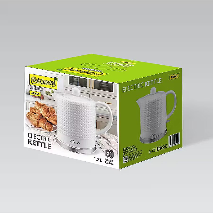Description - The Maestro MR-067 ceramic electric kettle is an elegant and functional device with a capacity of 1.2 liters, ideal for everyday use. With a power of 1200 W, it boils water, providing comfort and saving time. The kettle operates on a 220-240 V power supply, making it suitable for standard sockets.