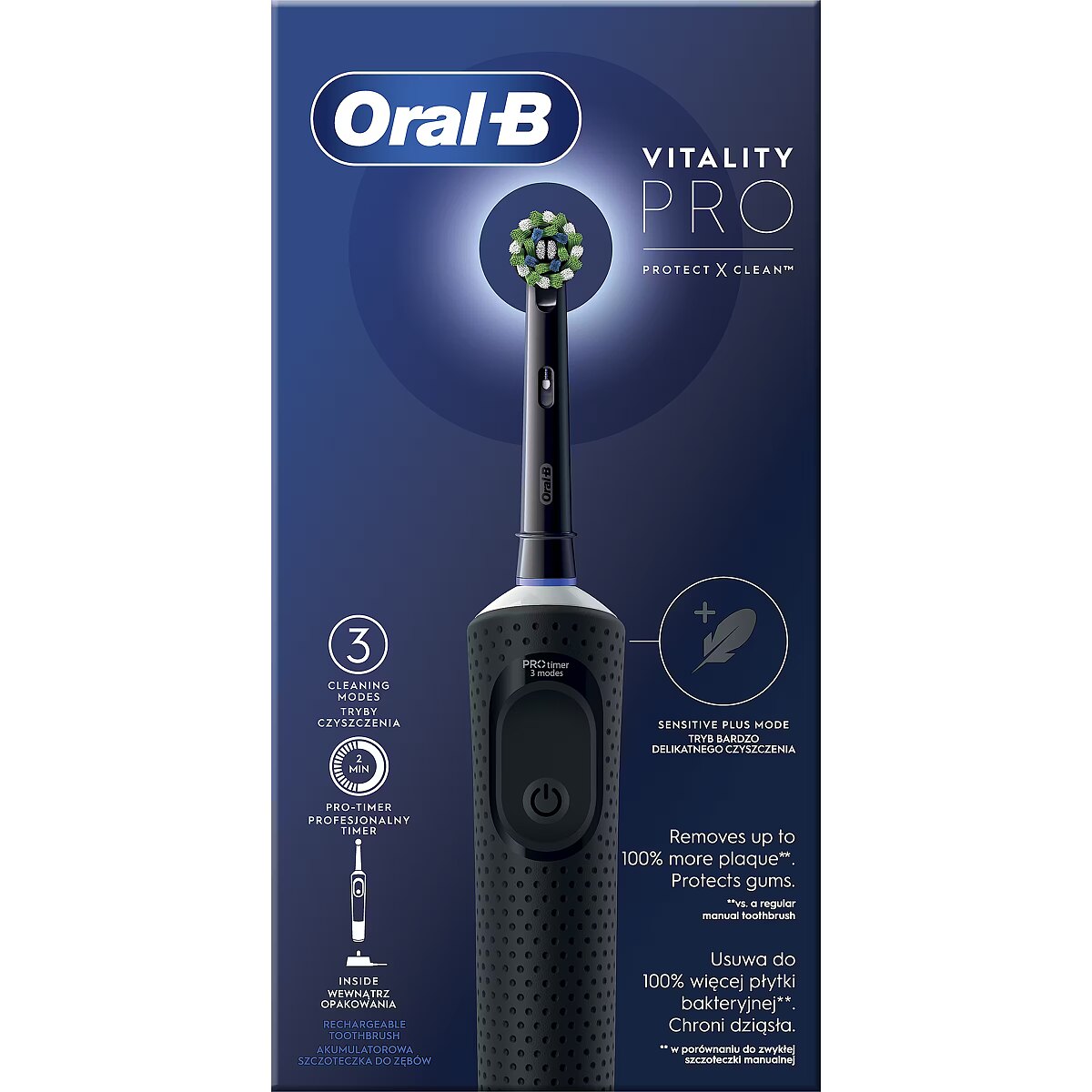 LongSummaryDescription - Oral-B Vitality Pro. Mērķis: pieaugušajiem, Zobu birstes tips: Zobu tīrīšanas režīmi: rotējoša rotējoša zobu birste, zobu tīrīšanas režīmi: Ikdienas kopšana, Sensitive, Super sensitive. Enerģijas avots: Akumulators, Akumulatora tips: Iebūvēta baterija. Iekļauto rokturu skaits: Komplektā iekļauto birstīšu galviņu skaits: 1 gab: Sastāvs: 1 gab.