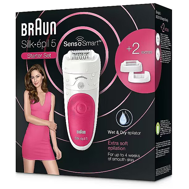 LongDesc - Braun Silk-épil 5 Wet & Dry Epilation Starter Set removes the short hairs waxing cannot catch, for long-lasting smooth skin for up to 4 weeks. Ideal for new users, the innovative SensoSmart technology guides your epilation so you use the right pressure, removing even more hairs in one stroke¹. Cordless and 100% waterproof, the epilator can be used in the bath or shower for gentle hair removal. With 2 extras; including massage rollers and skin contact cap.SensoSmart™An intelligent sensor guides your epilation, ensuring the right amount of pressure is applied to remove even more hair in one stroke.Epilator headThe comfort of Wet & DryIn your bath or in your shower, warm water helps you relax and makes it even more comfortable.Micro-grip TechnologyEfficiently removes hair by the root for long lasting smoothness.Skin Contact capImproved handling and adaptation to all body areas.High Frequency Massage SystemStimulates the skin for a more comfortable experience.Never lose controlWith the anti-slip grip. Better control, even in wet conditions.