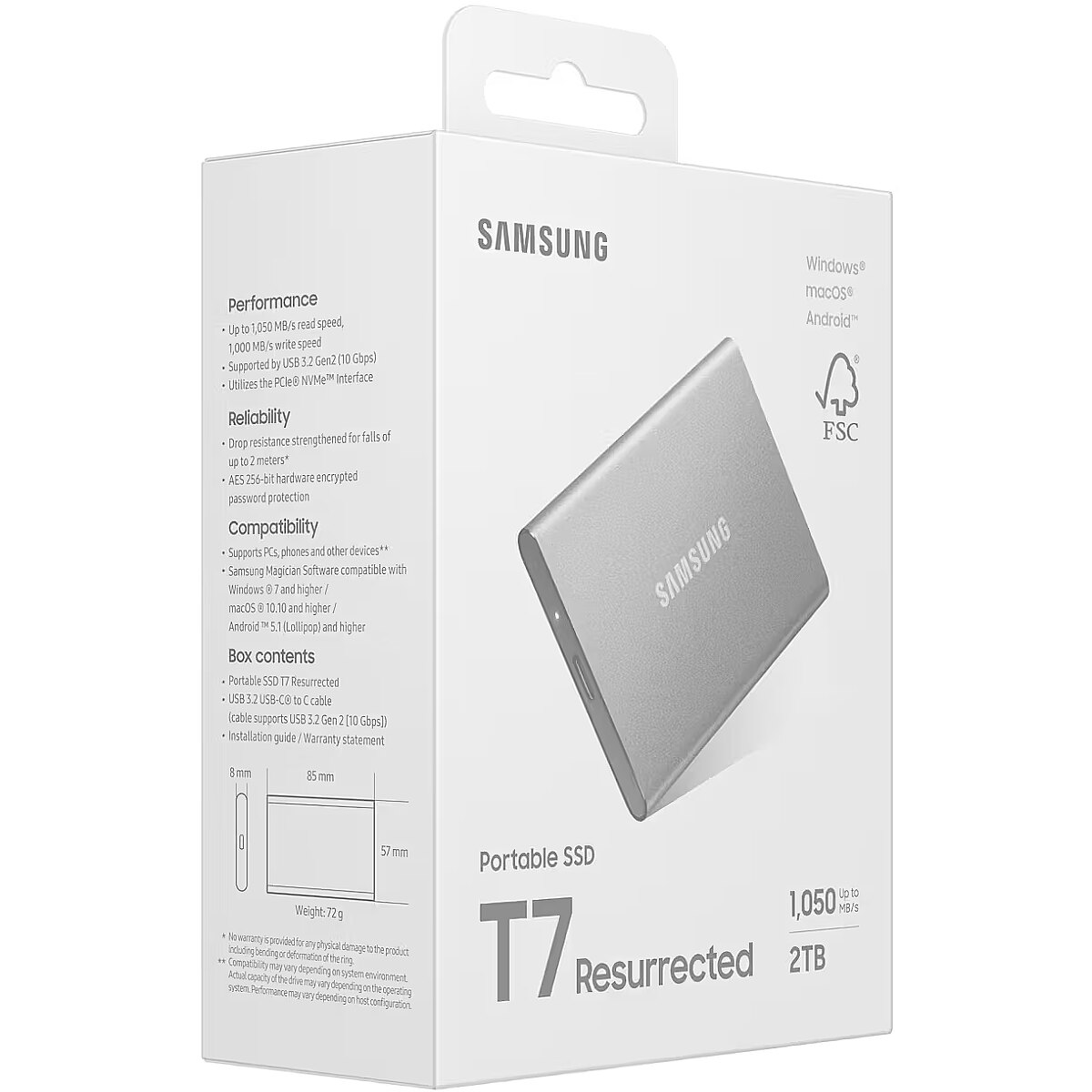MediumDescription EN - The Portable SSD T7 Resurrected is a fast, reliable and sustainably designed external drive that combines modern performance with thoughtful design. Made from recycled aluminium, it delivers lightning-fast transfer speeds and dependable everyday use across multiple devices. • Lightning-fast transfer speeds up to 1,050 MB/s• Recycled aluminium enclosure• USB 3.2 Gen 2 interface for high-speed performance• Compatible with Windows, macOS, smartphones and game consoles• Support for Samsung Magician software