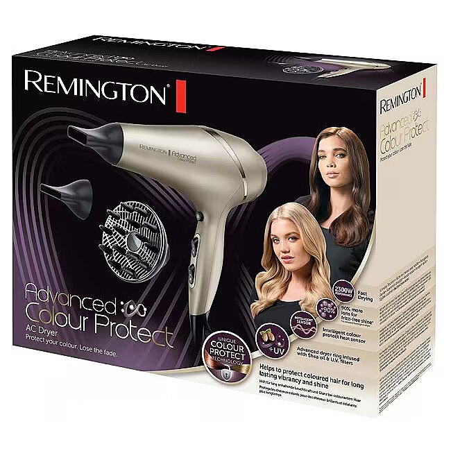LongDescription EN - Using Unique Colour Protect Technology, you can help protect coloured hair for long lasting vibrancy and shine.With an Intelligent Colour Protect Heat Sensor that ensures optimum heat every time, you can enjoy professional drying results whilst helping to prevent fading colour and breakage. The Advanced Micro-conditioning ring is infused with Shea oil and UV filters that transfer Micro-conditioners to the hair with every blow-dry giving you shiny, vibrant locks.Its impressive 2300 W dryer with a long life AC motor gives you a powerful performance with fast and effortless drying. Including everything you’ll need to create a look that will turn heads, the dryer features 3 heat settings, 2 speed options and a true cold shot – to secure those styled looks.