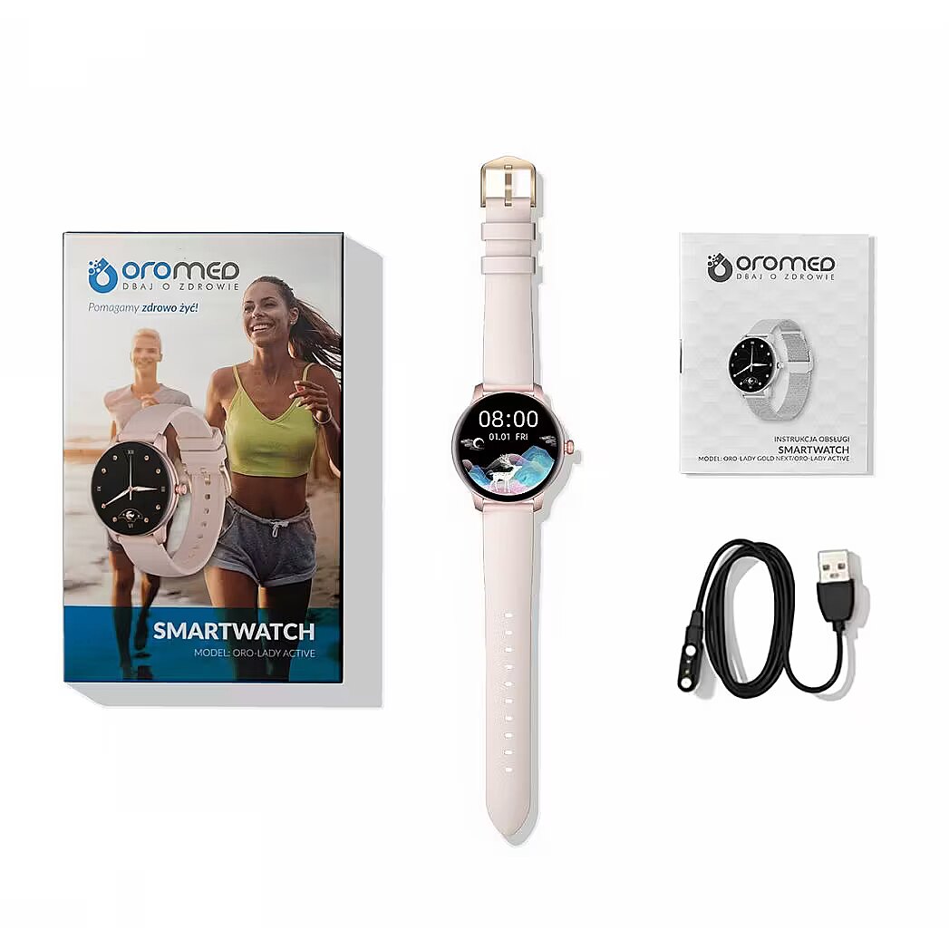 Accessories included - Box Smartwatch ORO LADY ACTIVE_GOLD NEXT (depending on model ) USB magnetic cable for charging Instruction manual in Polish and English Manufacturer's warranty card