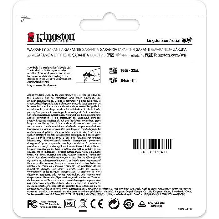 LongDesc - Kingston Canvas Select Plus microSD ir saderīga ar Android ierīcēm un izstrādāta ar A1 klases veiktspēju. Tā piedāvā uzlabotu ātrumu un ietilpību, lai ātrāk ielādētu lietojumprogrammas un uzņemtu attēlus un videoklipus ar dažādu ietilpību līdz pat 512 GB. Canvas Select Plus microSD ir jaudīga veiktspējas, ātruma un izturības ziņā, un tā ir izstrādāta, lai nodrošinātu uzticamību, fotografējot un veidojot augstas izšķirtspējas fotoattēlus vai filmējot un rediģējot Full HD video. Kingston Canvas kartes ir pārbaudītas kā izturīgas visnelabvēlīgākajos apstākļos un apstākļos, tāpēc varat tās ņemt līdzi visur ar pārliecību, ka jūsu fotogrāfijas, videoklipi un faili būs aizsargāti.Augstāks ātrums10. klases UHS-I ātrums līdz 100 MB/s.Optimizētas lietošanai ar Android ierīcēmAtjaunināta veiktspēja, izmantojot ar Android viedtālruni vai planšeti.dažāda ietilpībalīdz 512 GB, lai saglabātu visas neaizmirstamās fotogrāfijas un videoklipus.IzturīgaJūsu drošībai karte ir rūpīgi pārbaudīta un pierādīta kā ūdensizturīga,temperatūras, triecienu un vibrāciju izturīga un rentgenstaru izturīga.