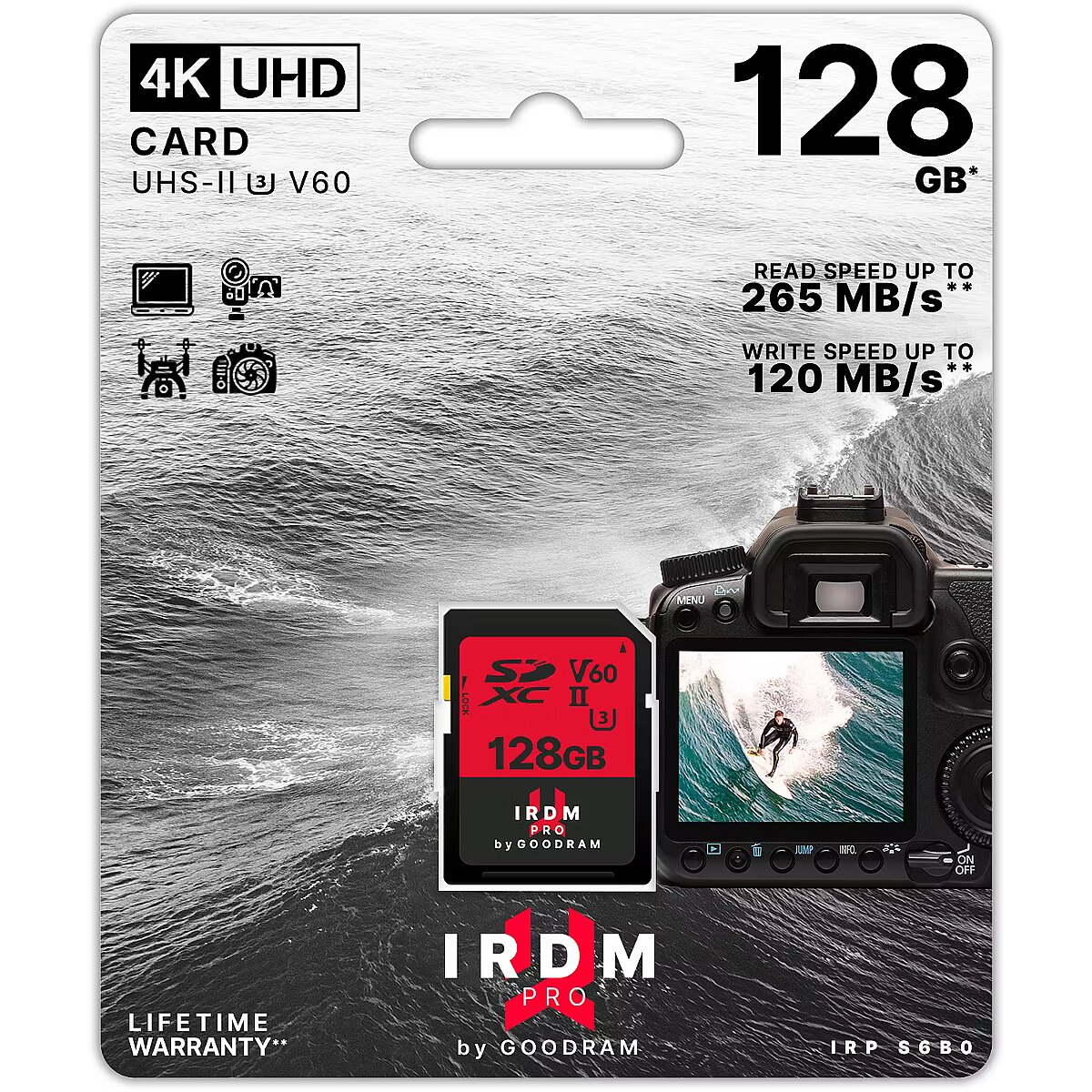 LongSummaryDescription - Goodram IRDM PRO. Capacity: 128 GB, Flash card type: SDXC, Internal memory type: UHS-II, Read speed: 265 MB/s, Write speed: 120 MB/s, UHS Speed Class: Class 3 (U3), Video Speed Class: V60. Product colour: Black, Red