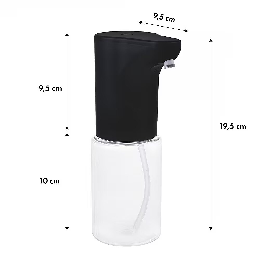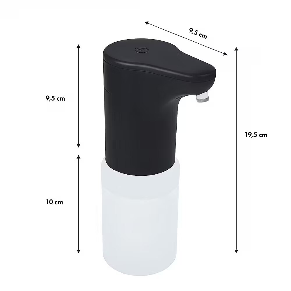 Dimensions - - Manufacturer: ProMedix - Model: PR-540 B - Capacity: 300 ml - Purpose: alcohol, disinfectants, hand soaps, disinfectant gels, shower gels, shampoos - Not suitable for: high viscosity alkaline liquid, perfume, gasoline, strong acid, viscous liquids and liquids containing particles, beads and impurities - Power supply: 4 x AA alkaline battery (not included) - Number of degrees of regulation of the amount of liquid released: 3 - Battery life: approximately 6 months (at 15 uses per day) - Dimensions: 100 x 68 x 195 mm - Protection class: IPX4 - Battery level indicator - Color: black.