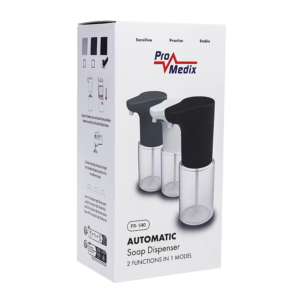 Description - Soap gel disinfectant liquid dispenser 300 ml Promedix automatic dispenser, dispenser container for liquid soaps, disinfectant liquids, 300ml, 4xAA, black, PR-540 B The Promedix PR-540 automatic dispenser is a practical device for dispensing liquid soaps, liquid and disinfectant gels, shower gels, shampoos, etc. It has a capacity of 300 ml, which makes it ideal for use at home or in public places. Powered by four AA batteries, it provides convenience and ease of use. The device is equipped with an infrared motion sensor, so that a small amount of liquid will be released when you put your hand under the sensor. A three-stage adjustment of the amount of liquid released allows you to adjust the dispenser to your needs. In addition, the set includes a tip that, when screwed in, allows dispensing the liquid in the form of a spray. The PR-540 dispenser is an excellent solution for those who value hygiene and convenience. Thanks to the automatic mechanism, the user does not need to touch the device, which minimizes the risk of transmission of bacteria. Ideal for use in bathrooms, kitchens or offices where cleanliness is a priority. The 300 ml capacity allows for longer use without the need for frequent refills. Battery power allows the dispenser to be placed anywhere without the need to be plugged in.