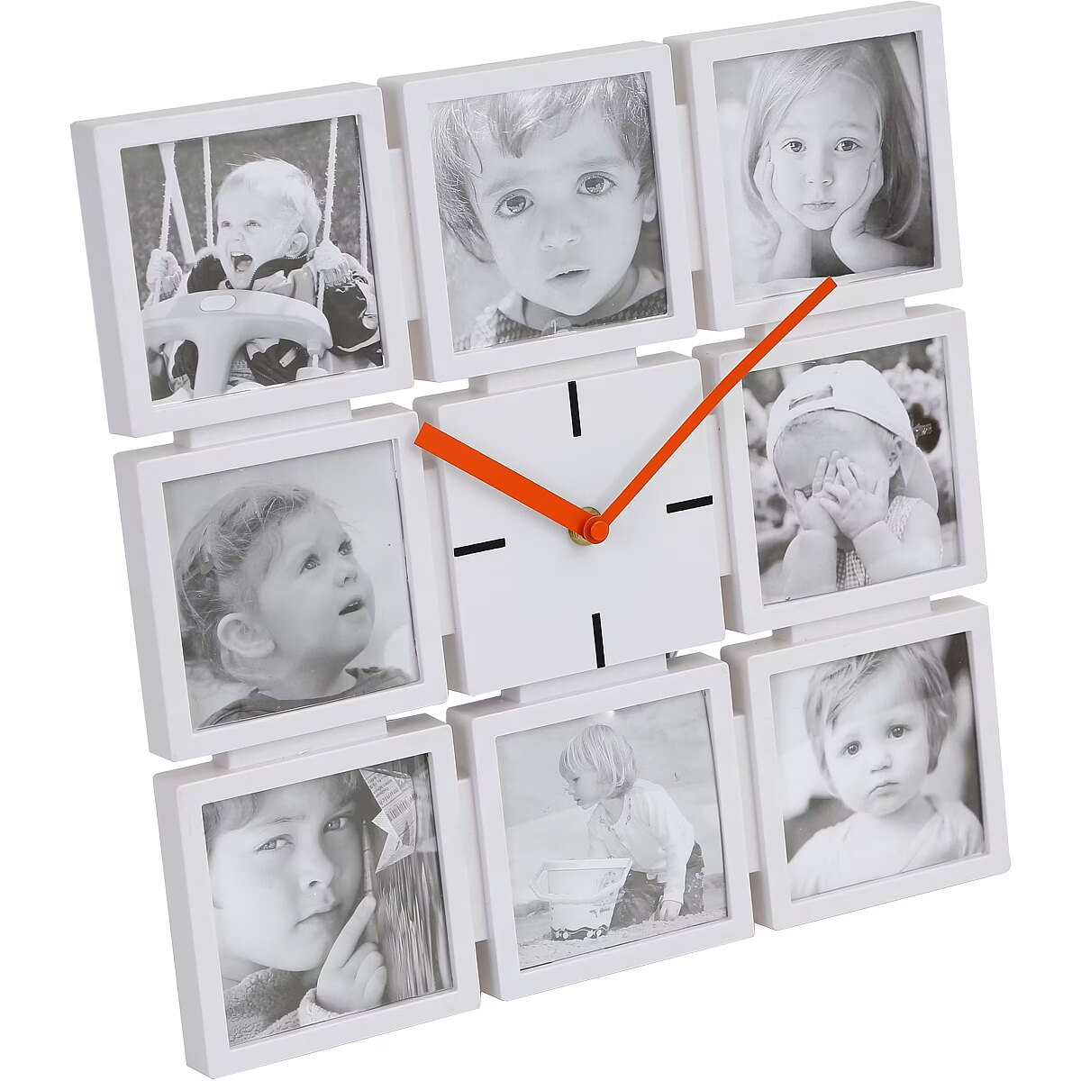 description_short_en - Two-in-one wall clock and photo frame Fits eight 10x10 photos Minimal white frame